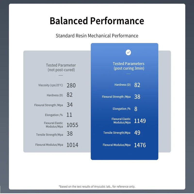 ANYCUBIC's photosensitive resin offers a one-year shelf life, ensuring extended stability for all your creative needs. With a low shrinkage of 7.1% and a measured viscosity of 552 mPa·s, it allows for easy handling without the worry of high chemical content.