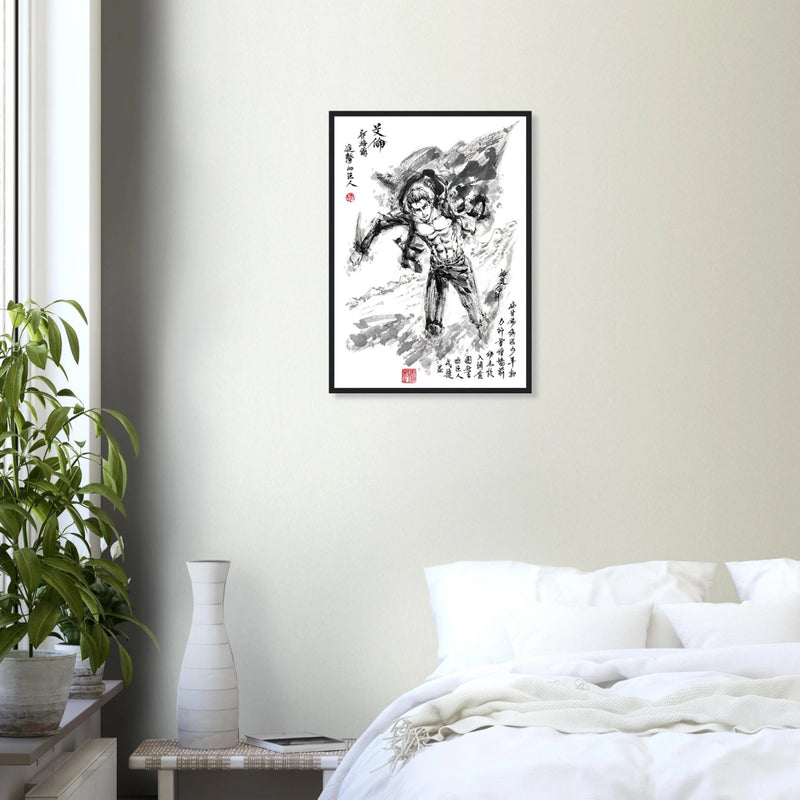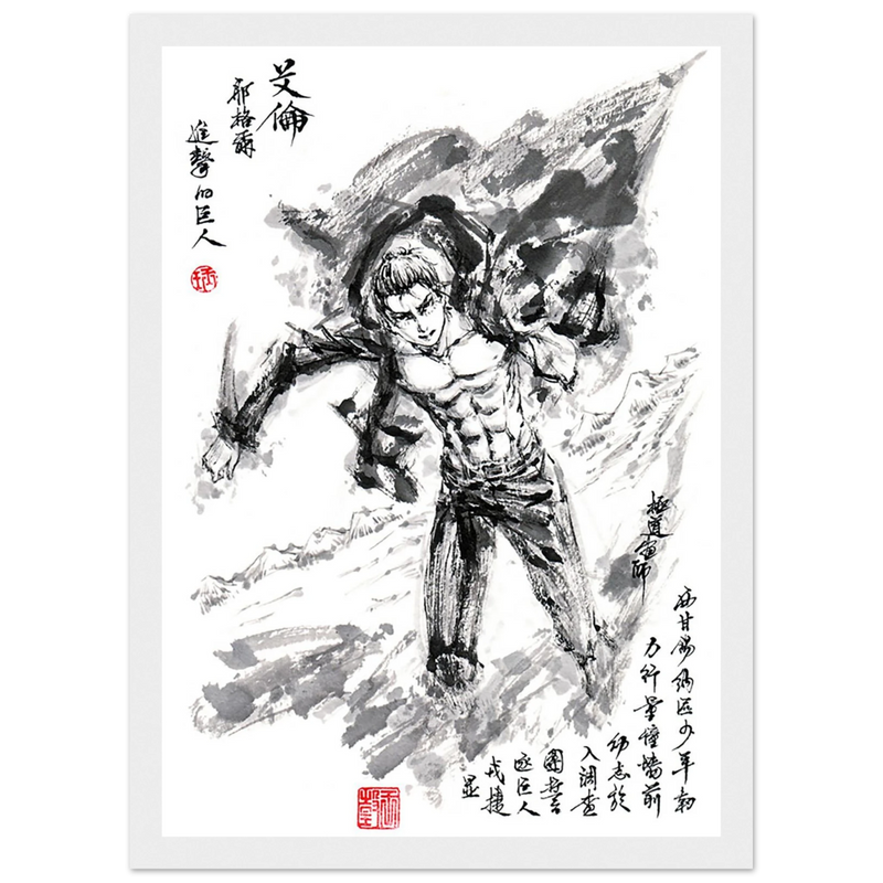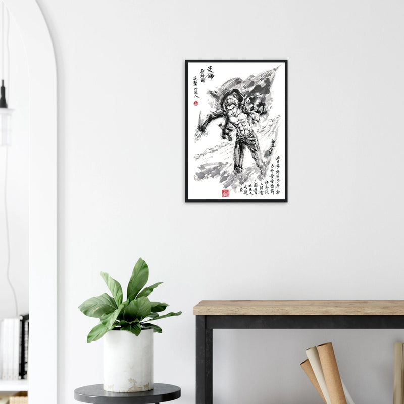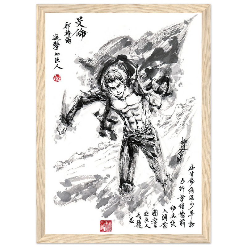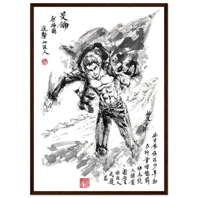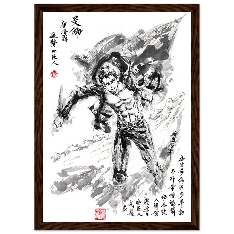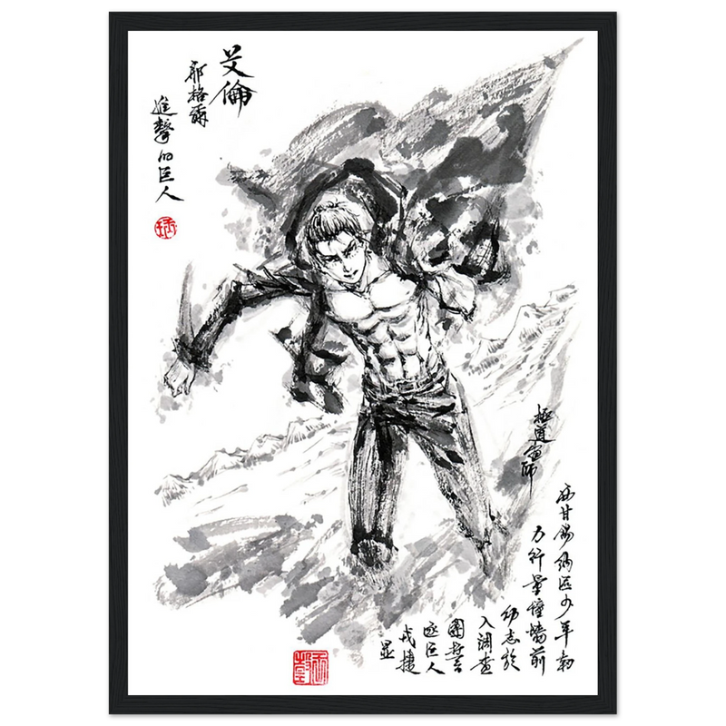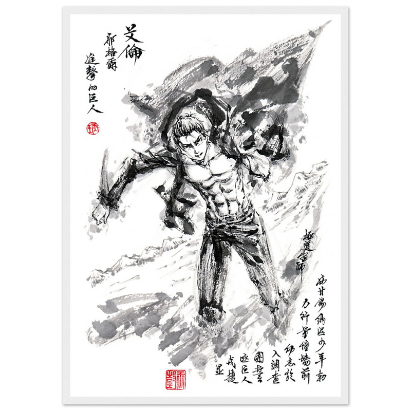 Immerse yourself in the epic world of Attack on Titan with this striking artwork, capturing Eren Jaeger's legendary transformation. Created in a graphic style that blends the power of manga with the finesse of oriental calligraphy, this piece transcends mere illustration to become a true tribute to the character.