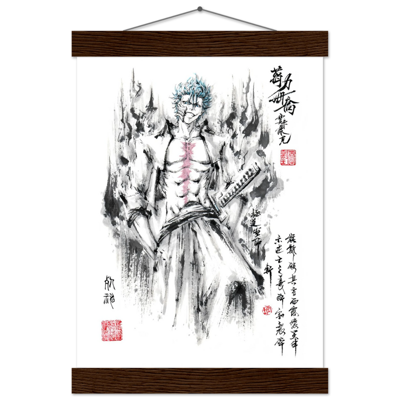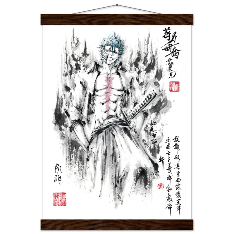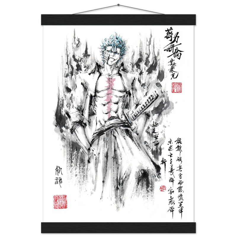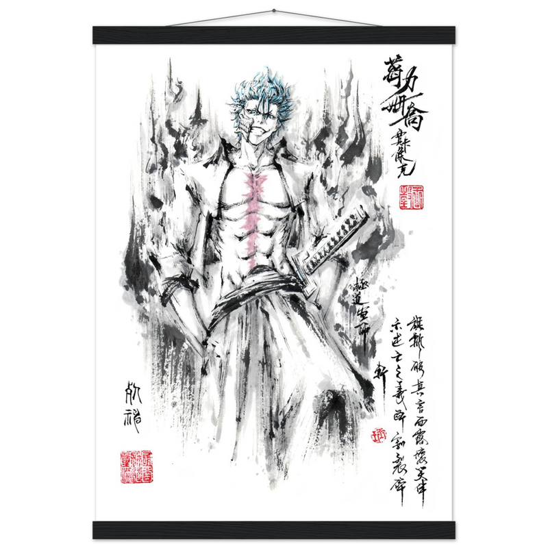 Immerse yourself in the tumultuous world of BLEACH with this striking artistic interpretation of Grimmjow Jaegerjaques, the explosively temperamental Espada number 6. This creation blends the character's characteristic savagery with the technical mastery of oriental ink painting, offering a unique vision where raw power meets calligraphic elegance.