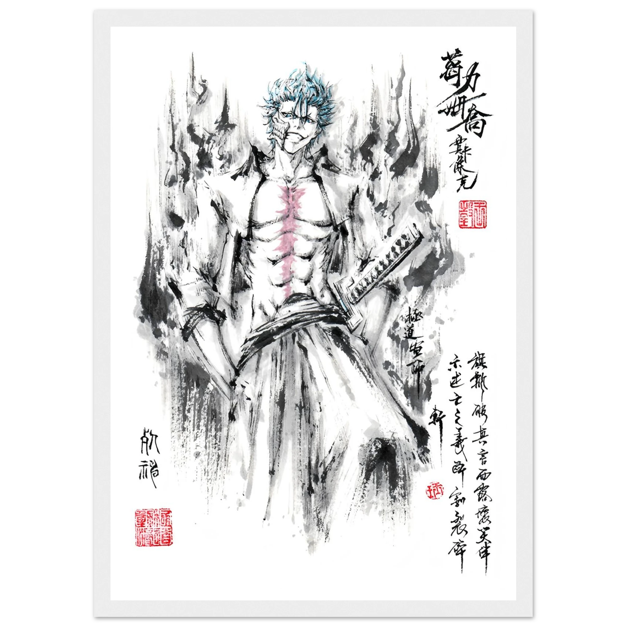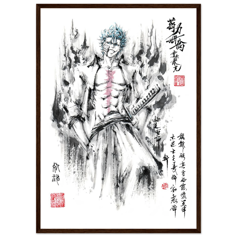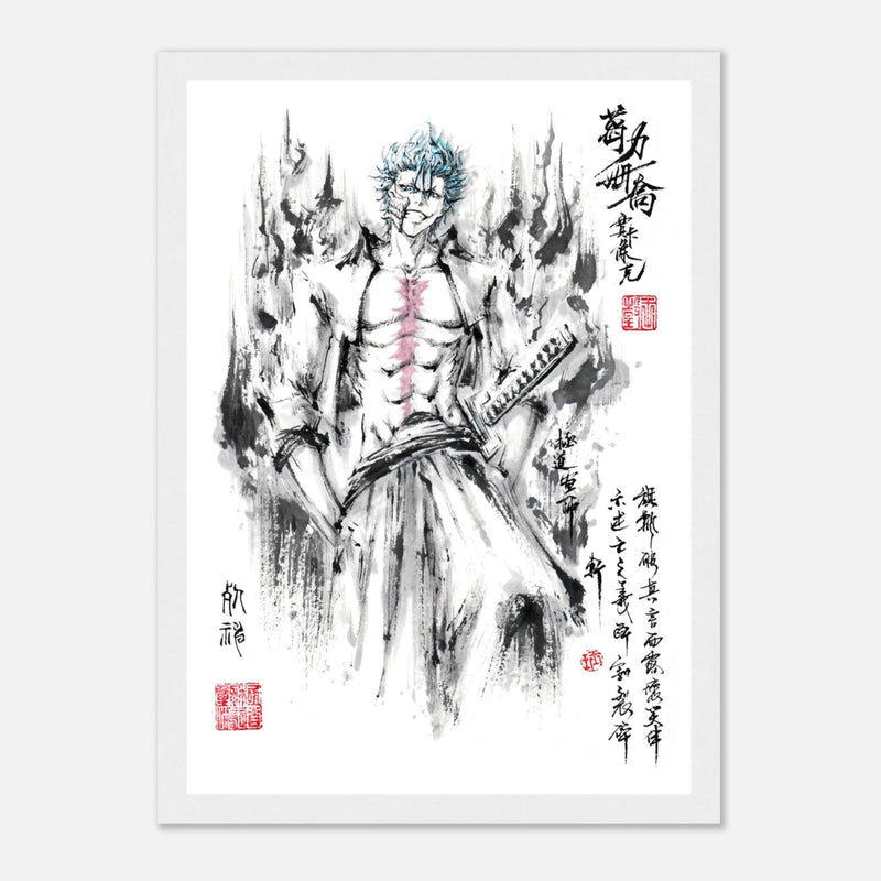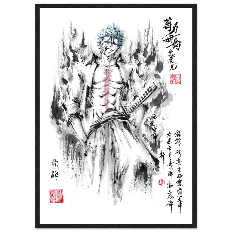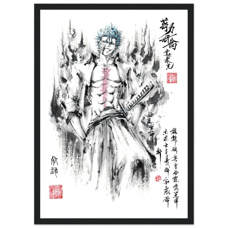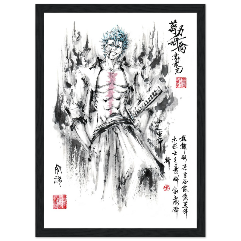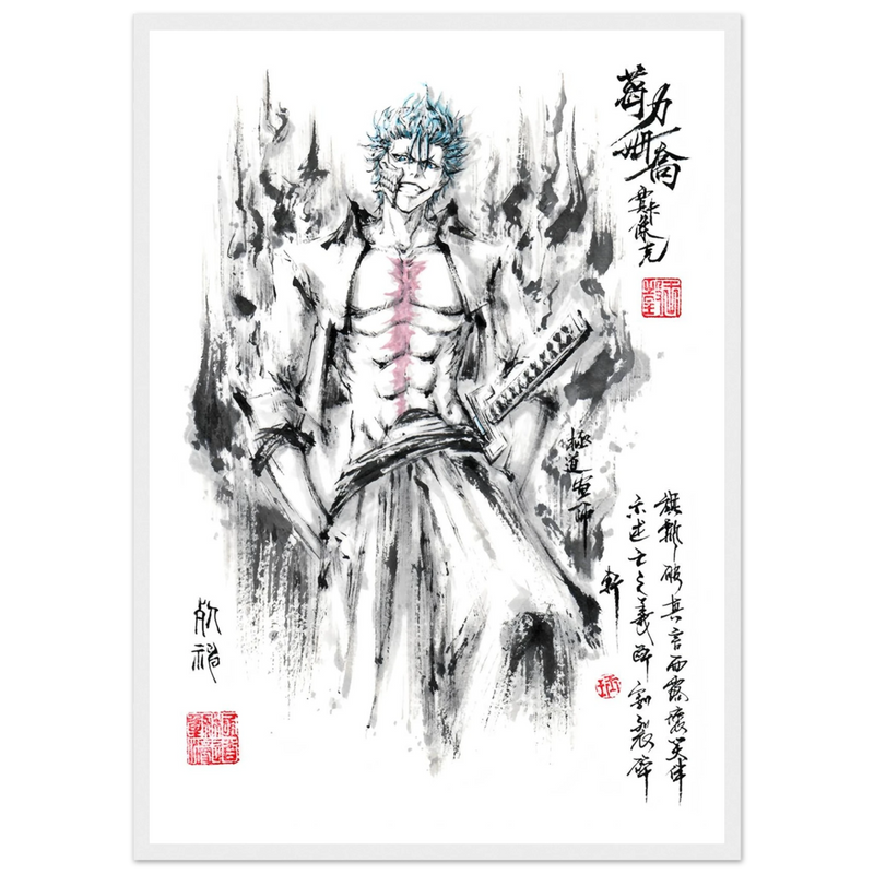 Immerse yourself in the tumultuous world of BLEACH with this striking artistic interpretation of Grimmjow Jaegerjaques, the explosively temperamental Espada number 6. This creation blends the character's characteristic savagery with the technical mastery of oriental ink painting, offering a unique vision where raw power meets calligraphic elegance.
