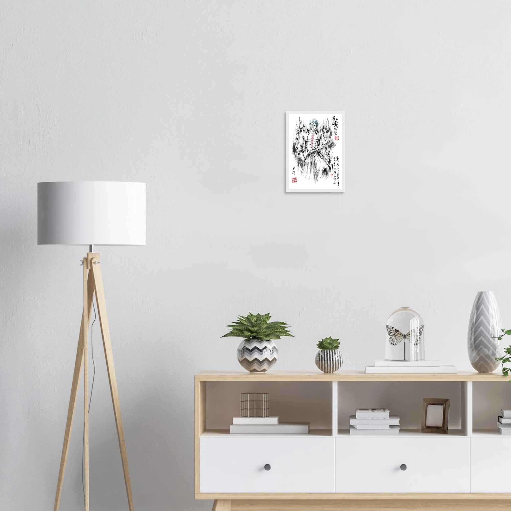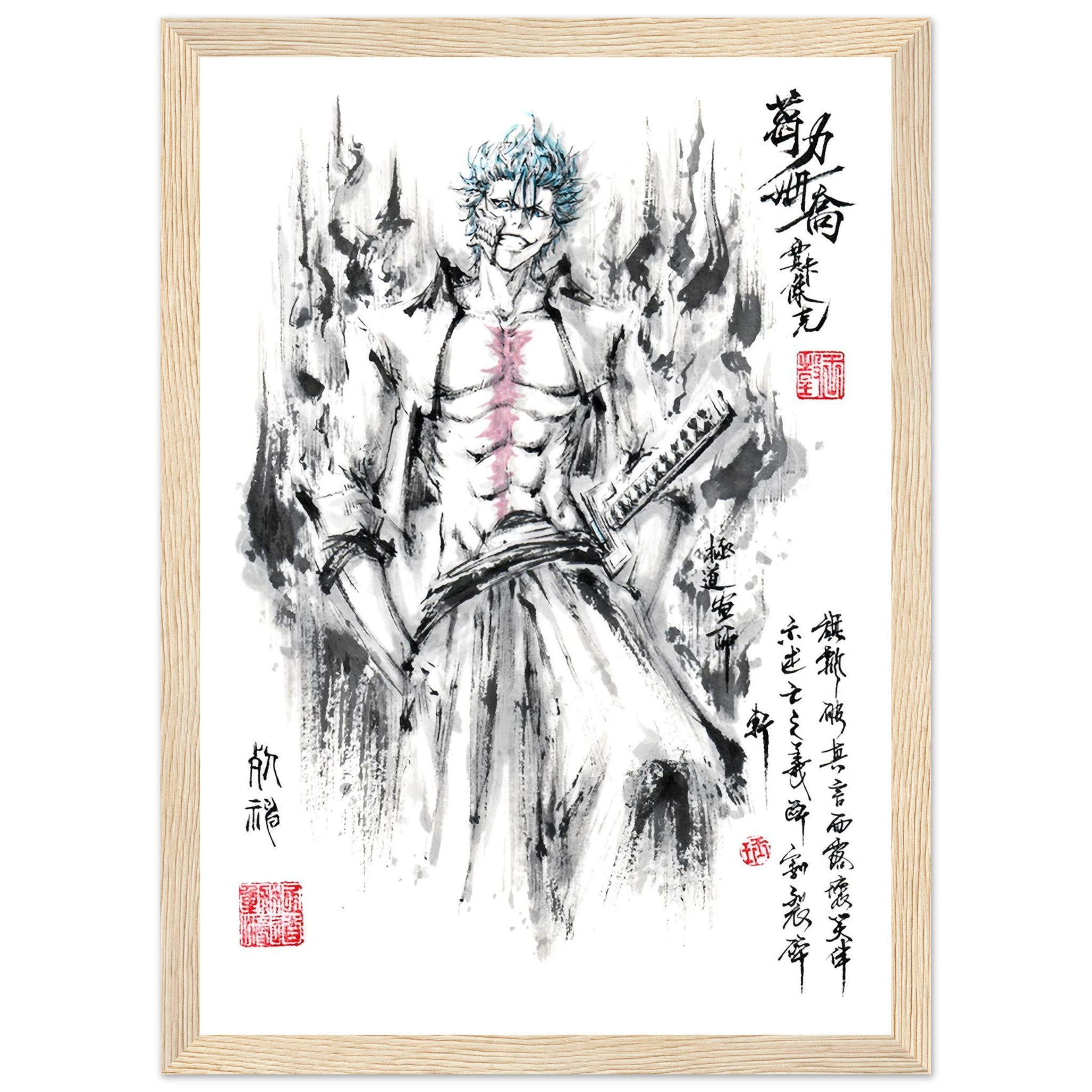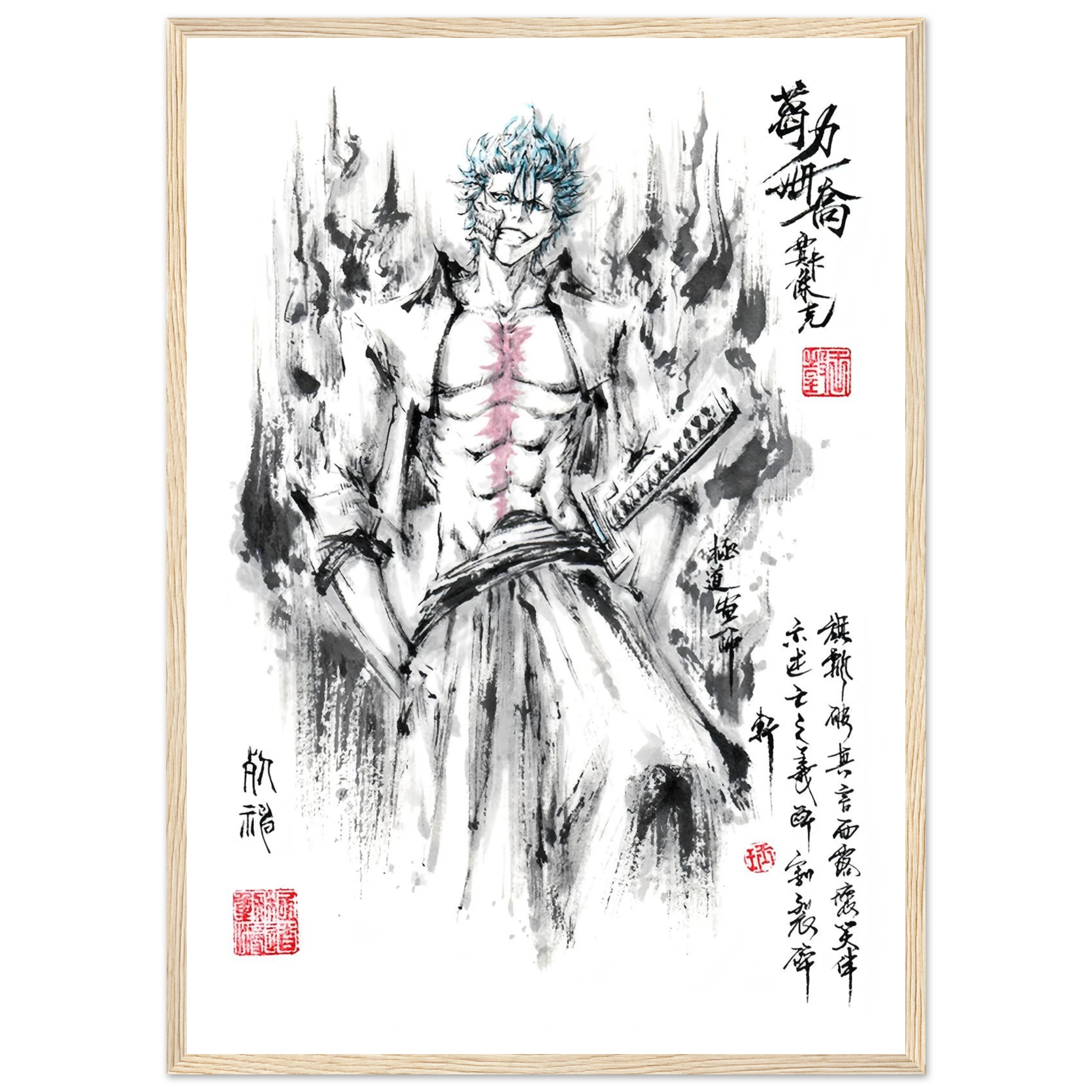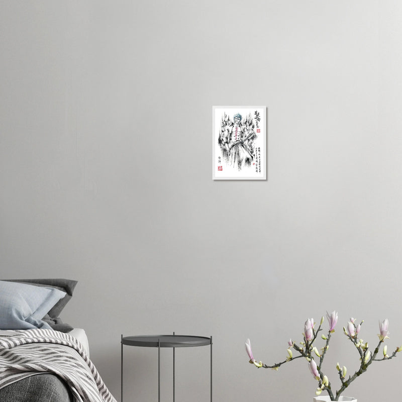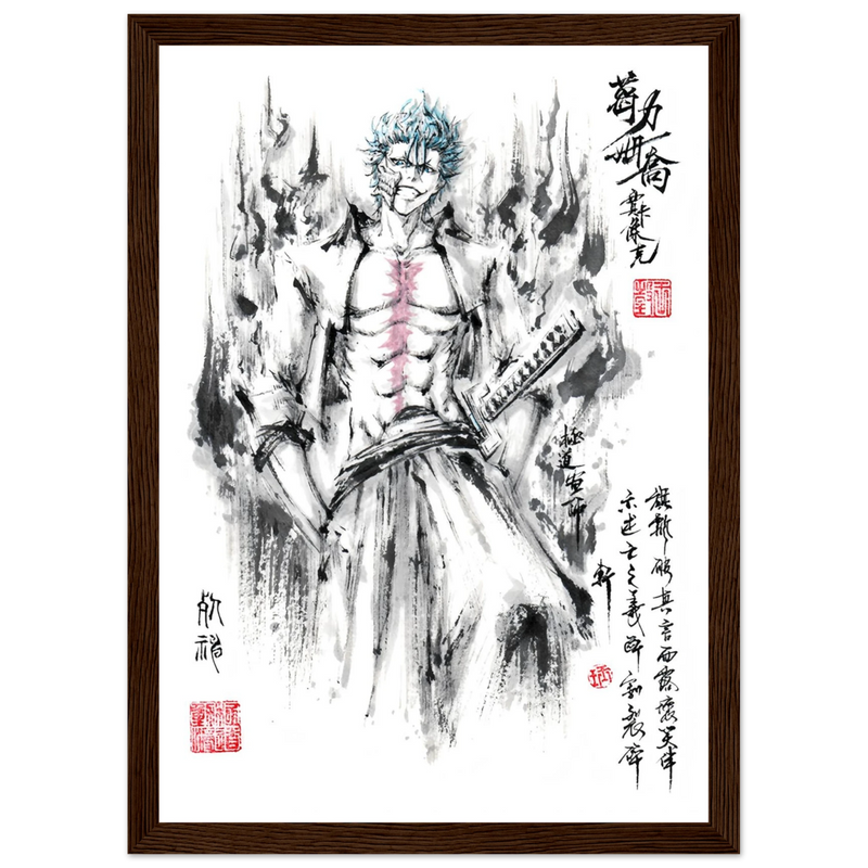 Immerse yourself in the tumultuous world of BLEACH with this striking artistic interpretation of Grimmjow Jaegerjaques, the explosively temperamental Espada number 6. This creation blends the character's characteristic savagery with the technical mastery of oriental ink painting, offering a unique vision where raw power meets calligraphic elegance.