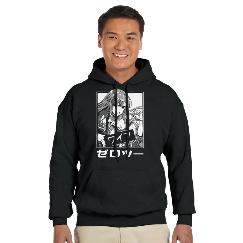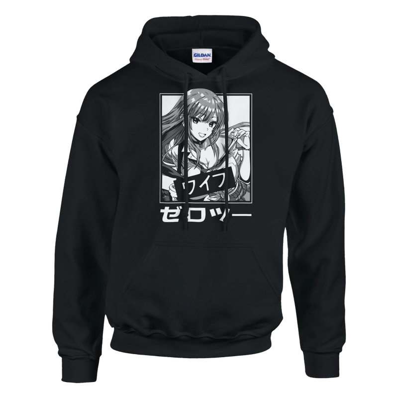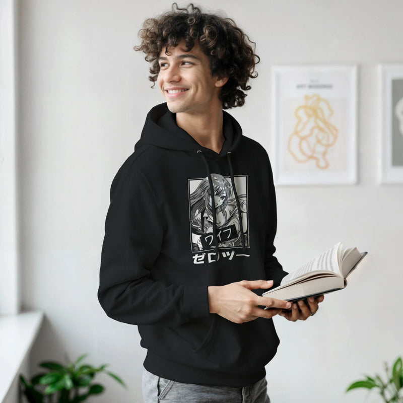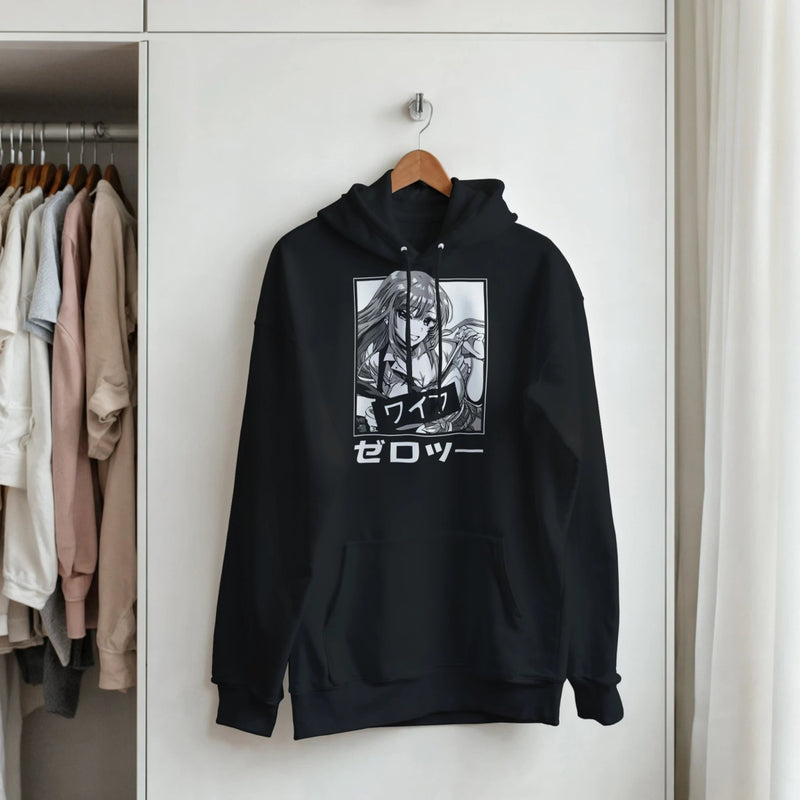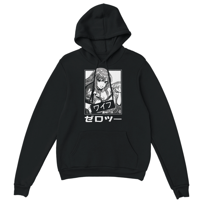 The front print is a finely detailed black and white illustration. It features a young anime woman with long, dark hair framing an expressive face. Her stylish yet casual look, with an open-necked shirt and vest, exudes confidence and serene charm . Her engaging smile and lively gaze capture a cheerful and friendly personality, reminiscent of the spirit of the characters in My Dress-Up Darling . Authenticity and narrative depth are enhanced by the presence of bold Japanese inscriptions: "ワイフ" (Waifu) , an otaku term of endearment for a beloved fictional character, and "ゼロツー" (Zero Two) , adding an intriguing layer of cultural reference for those in the know.