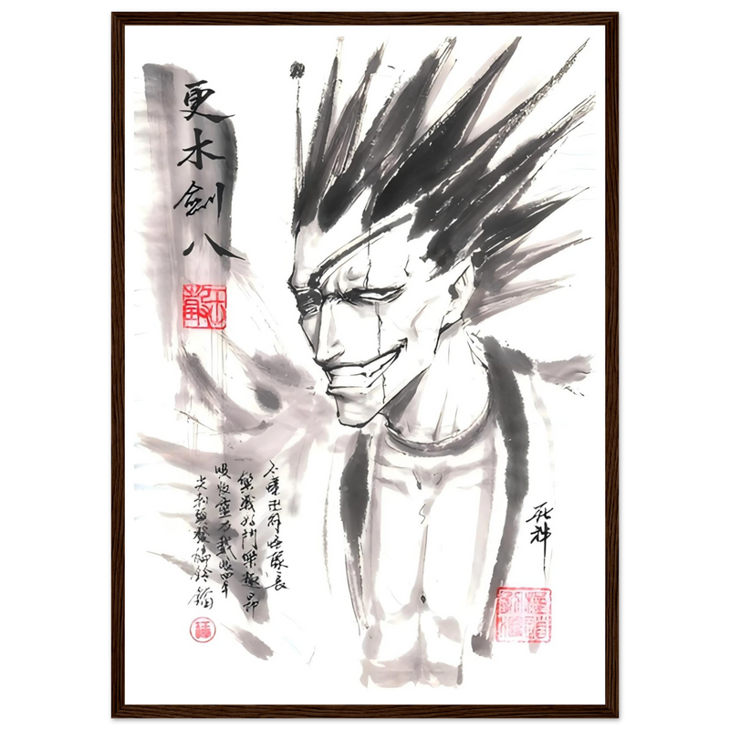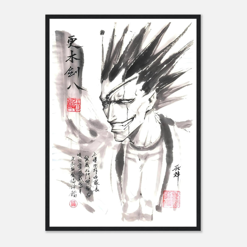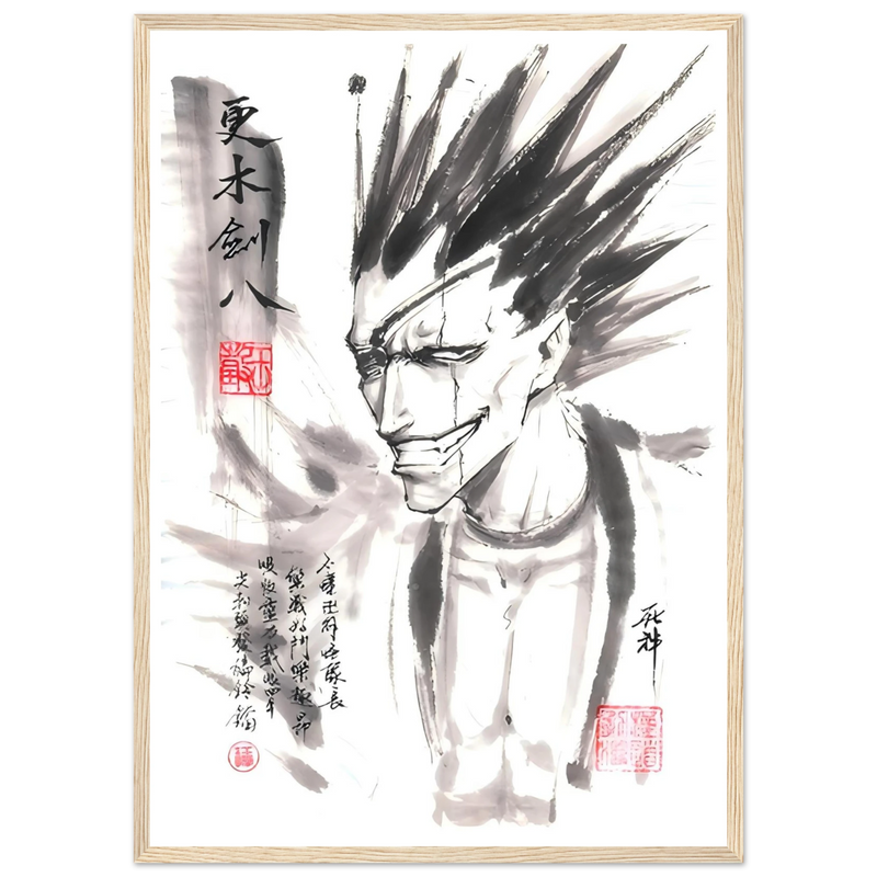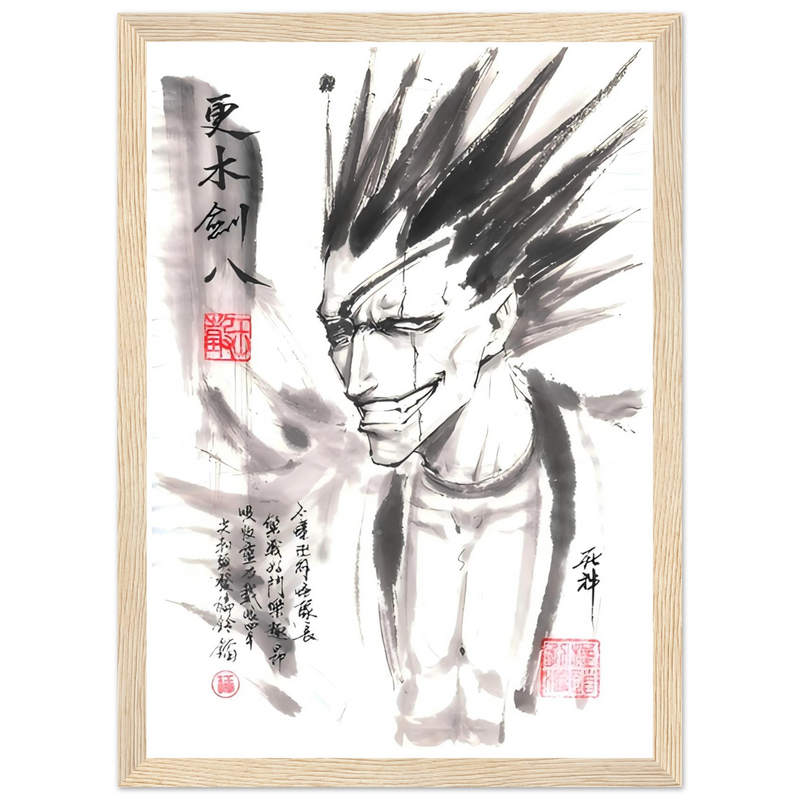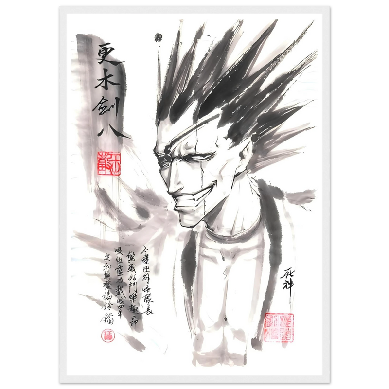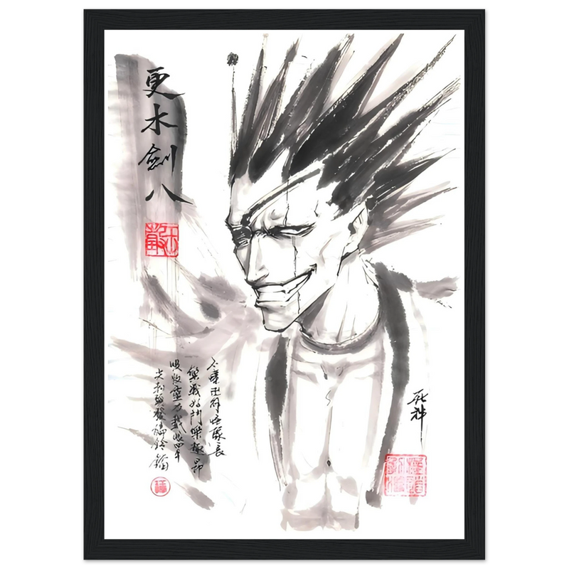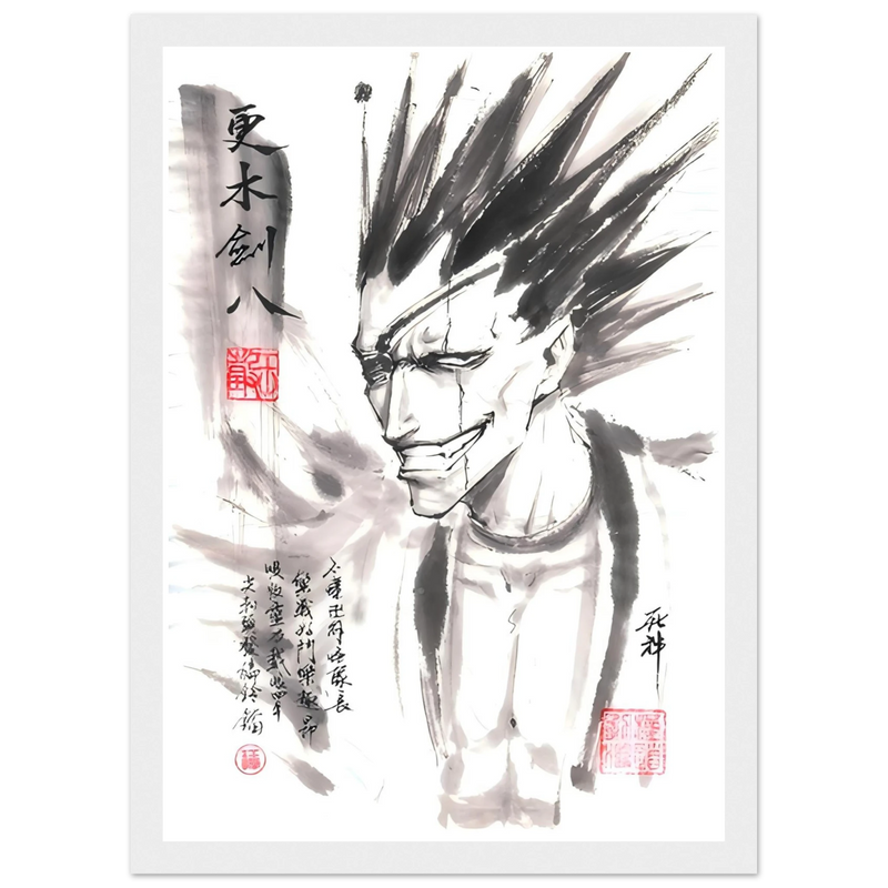 Immerse yourself in the brutal world of BLEACH with this striking artistic interpretation of Kenpachi Zaraki, the wildest captain of the Gotei 13. This unique creation fuses the character's characteristic violence with the delicacy of traditional sumi-e aesthetics, offering a graphic contrast that is as striking as it is memorable.