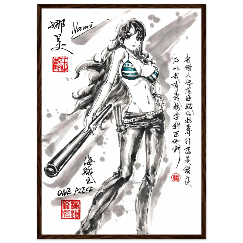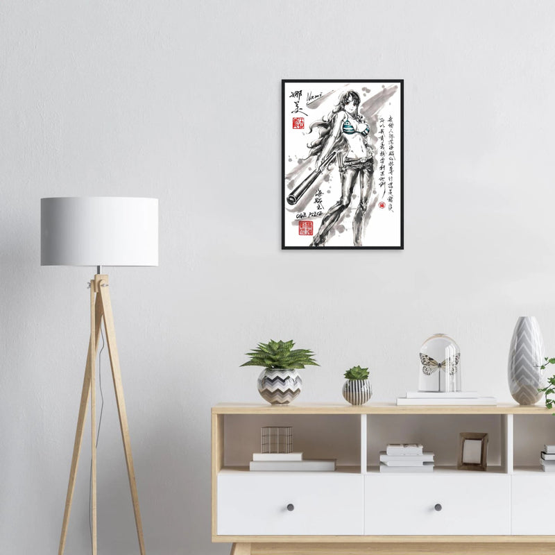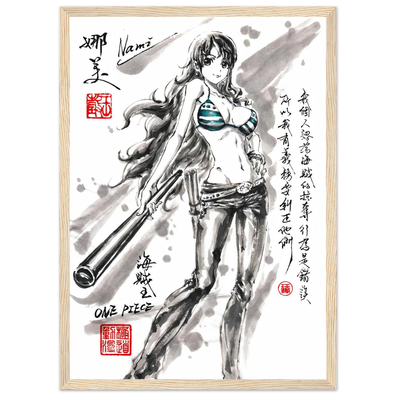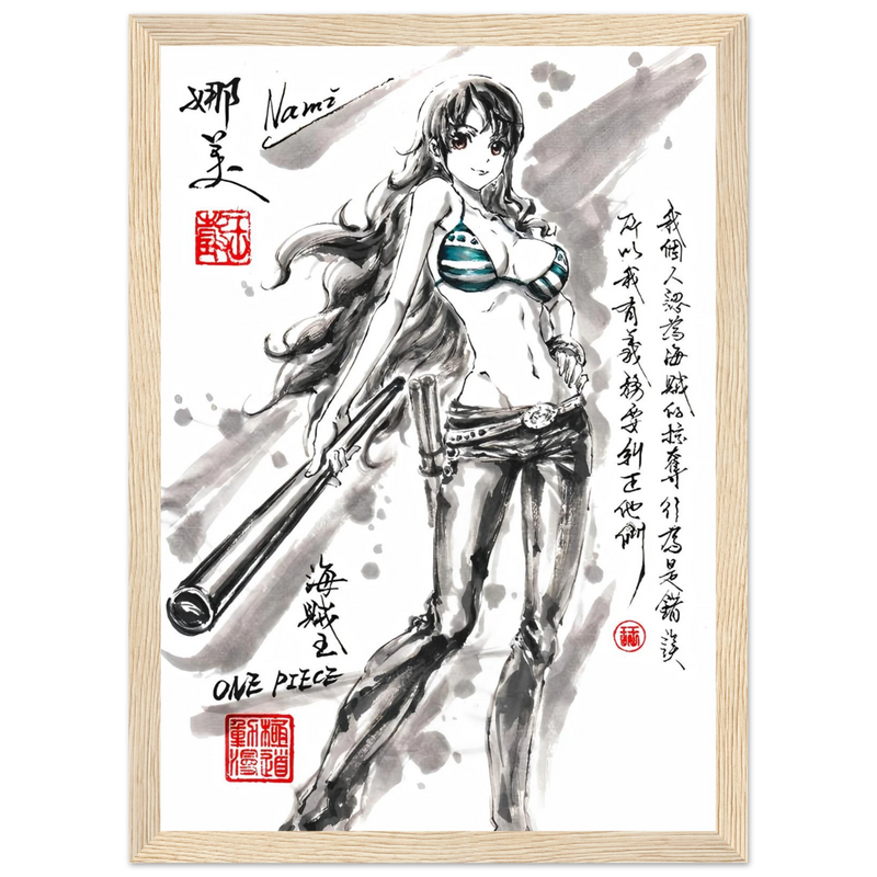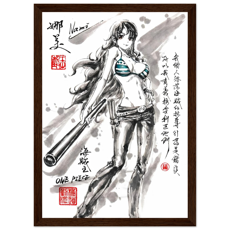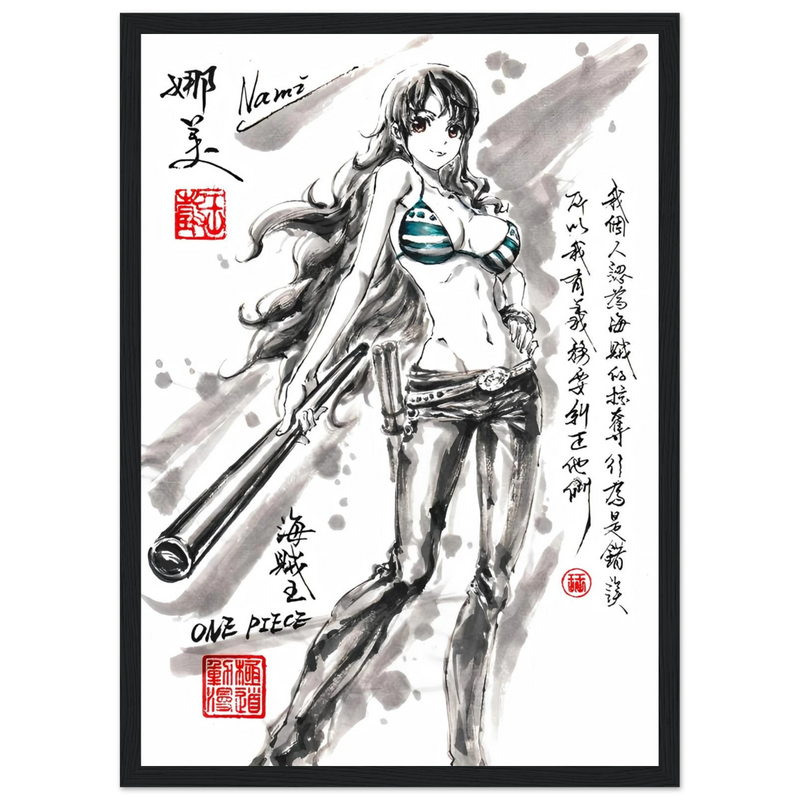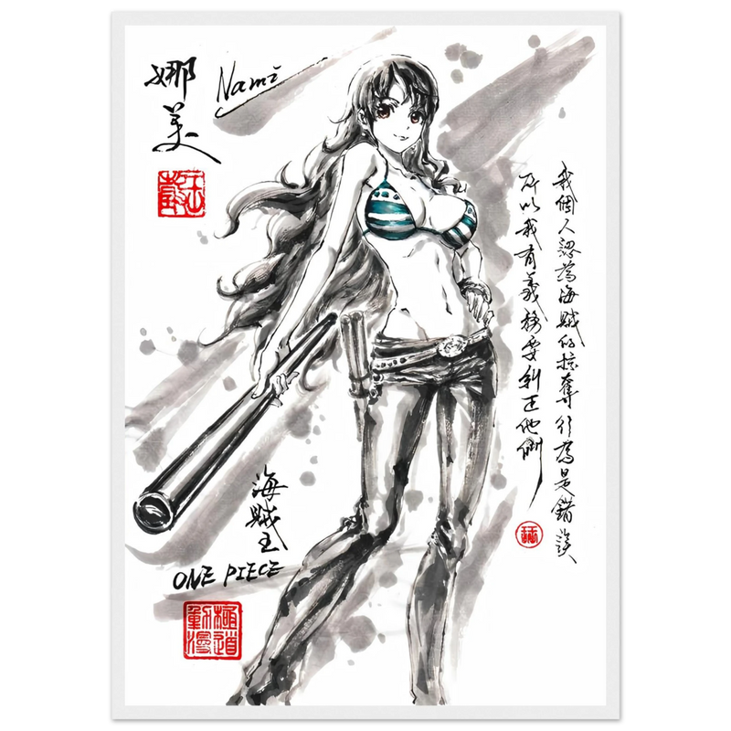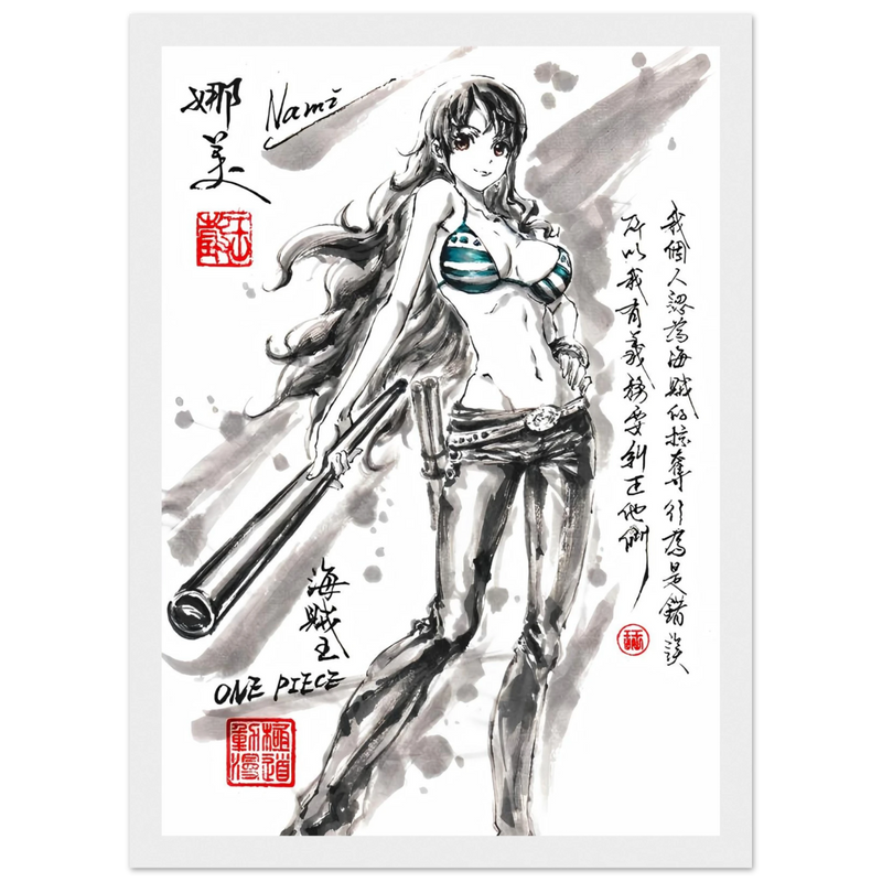 Discover a unique artistic interpretation of Nami, the brilliant navigator of the Straw Hat crew. This exclusive artwork combines the finesse of traditional ink painting with the dynamic world of One Piece , creating a tribute where the elegance of the brushstroke meets the energy of the manga.