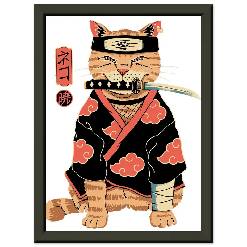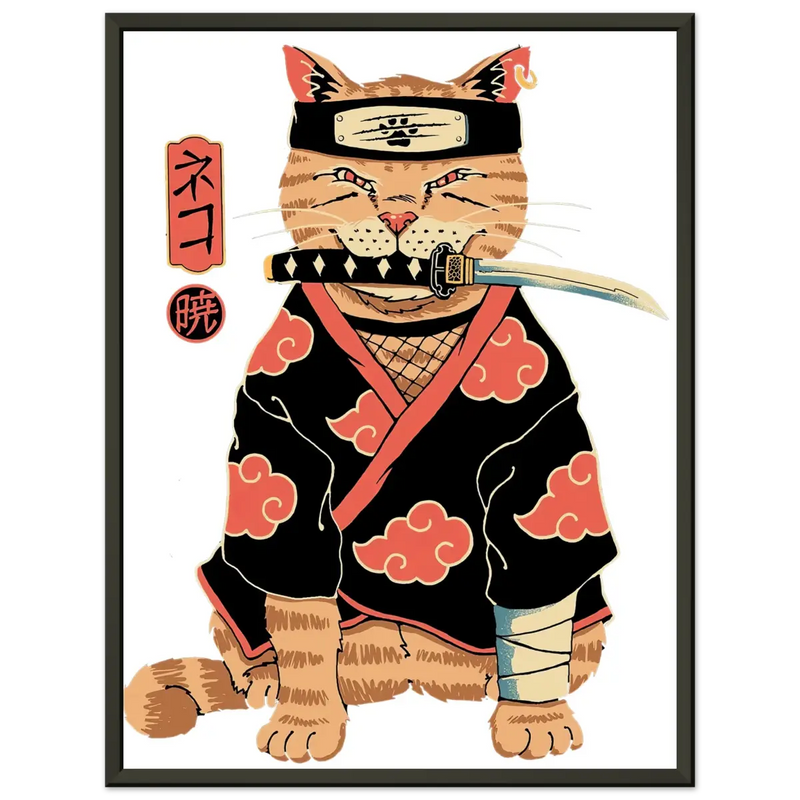The central print features an orange feline transformed into a formidable ninja of the Akatsuki Clan. The cat sports the group's iconic attire: a ninja hat (kakashi) and a black cape adorned with the organization's characteristic red clouds. The details are meticulously crafted, from the sword held in its mouth to the bandage on its paw, giving it an attitude that is both cute and powerful. The finishing touch? The elegant Japanese characters that accompany it: 「ネコ」 (Neko, "Cat") and 「暁」 (Akatsuki, "Twilight"), for complete authenticity.