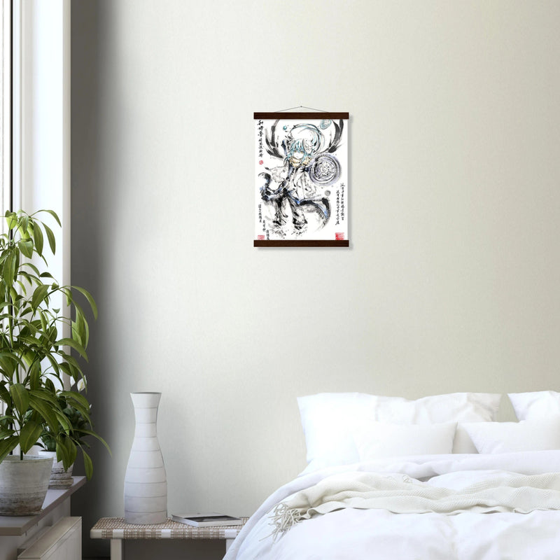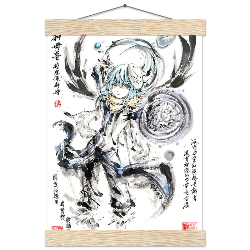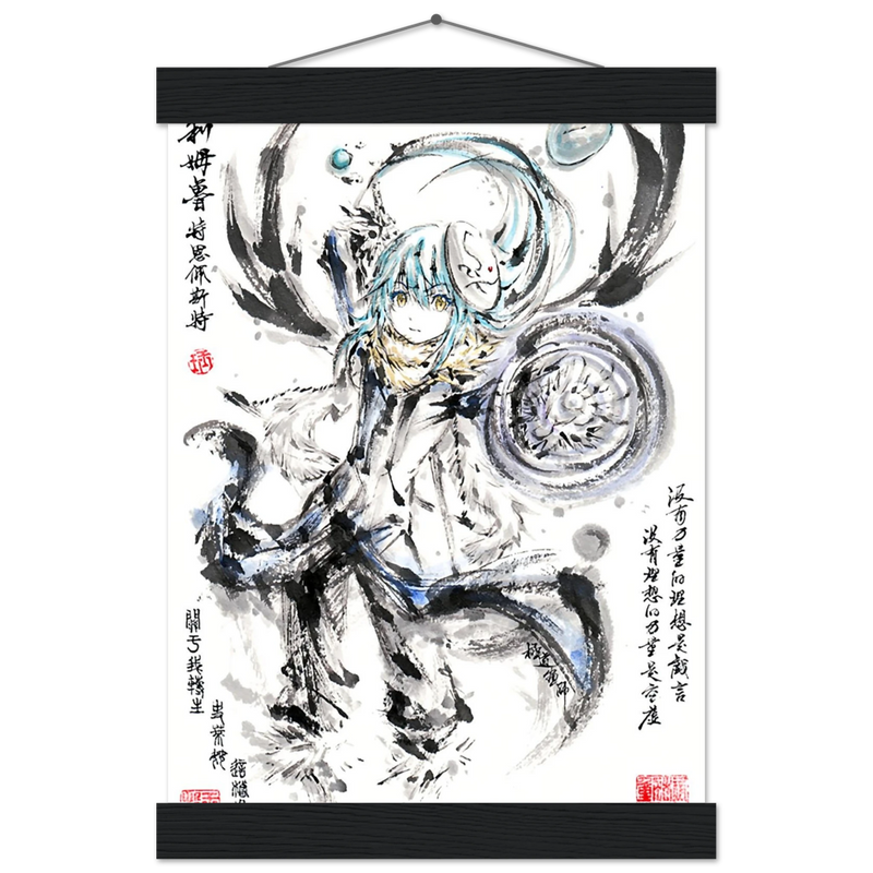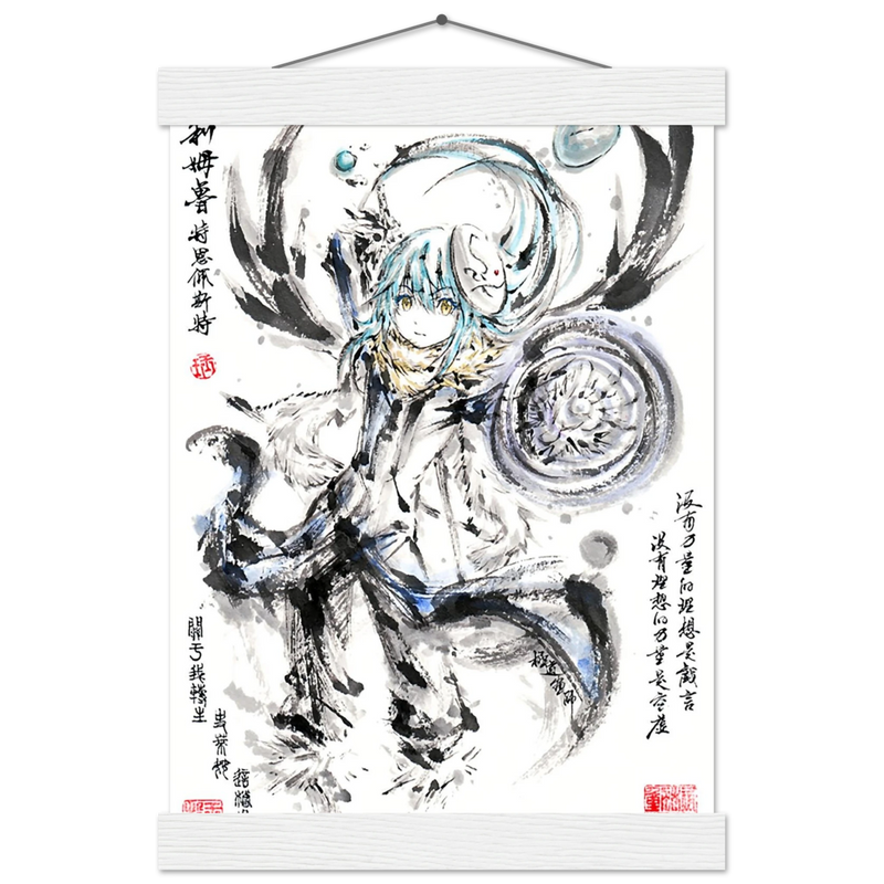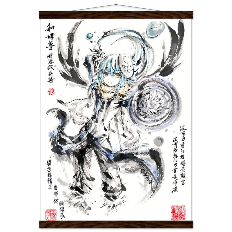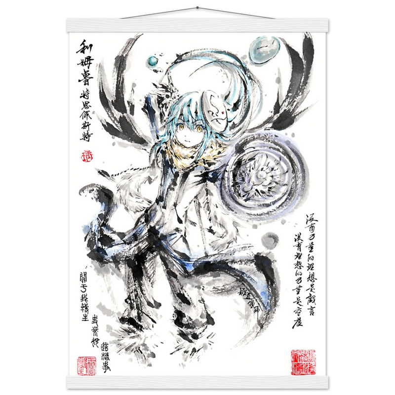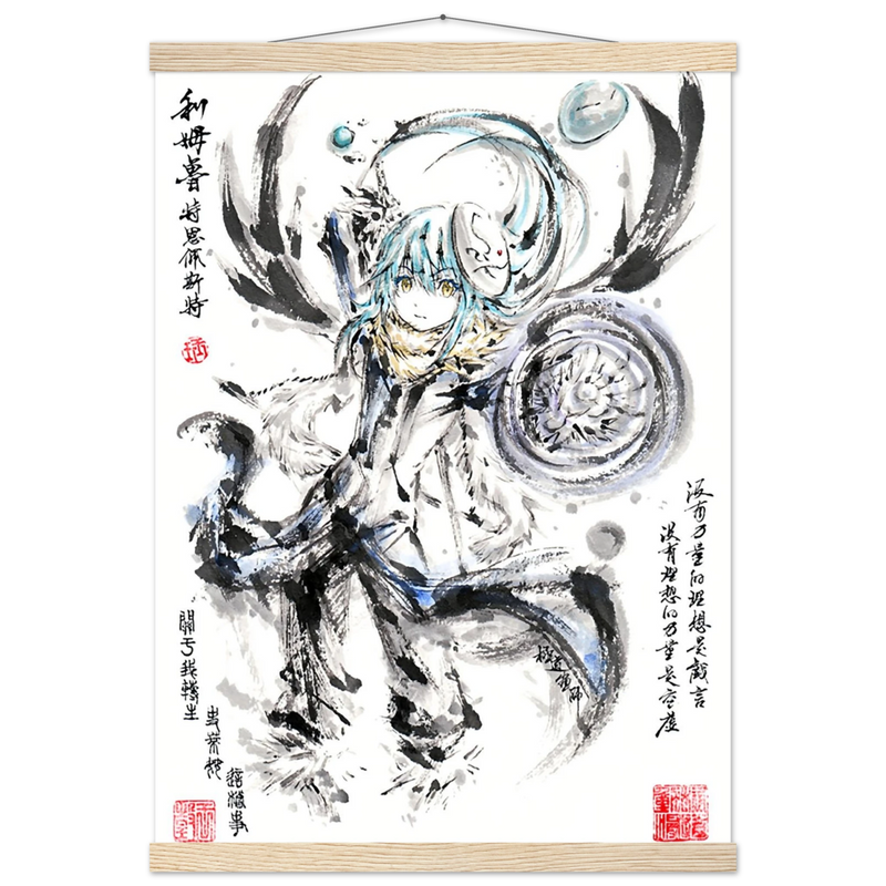 Discover a breathtaking artistic interpretation of Rimuru Tempest, the iconic hero of the anime That Time I Got Reincarnated as a Slime . This exclusive creation blends the magic of the fantasy world with the traditional finesse of sumi-e aesthetics, in a composition where ink and washes bring the legendary slime to life.