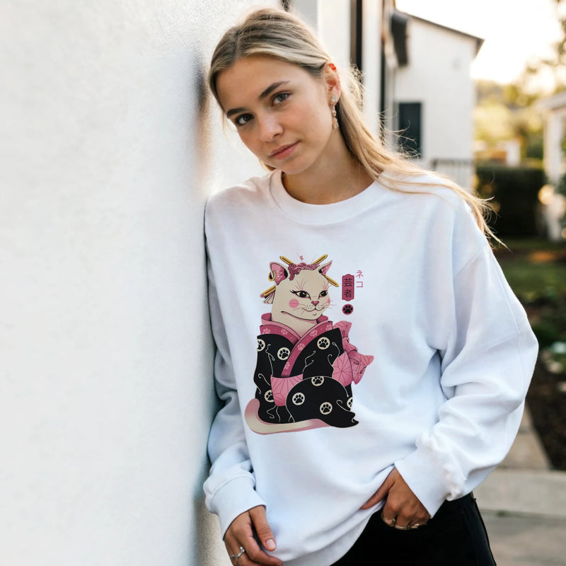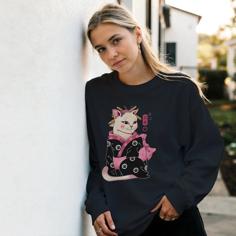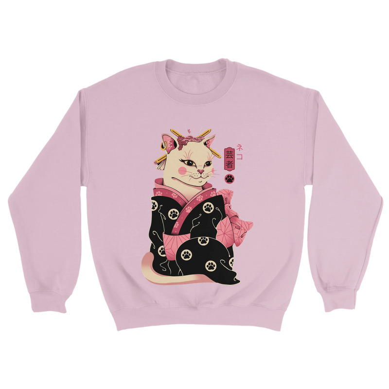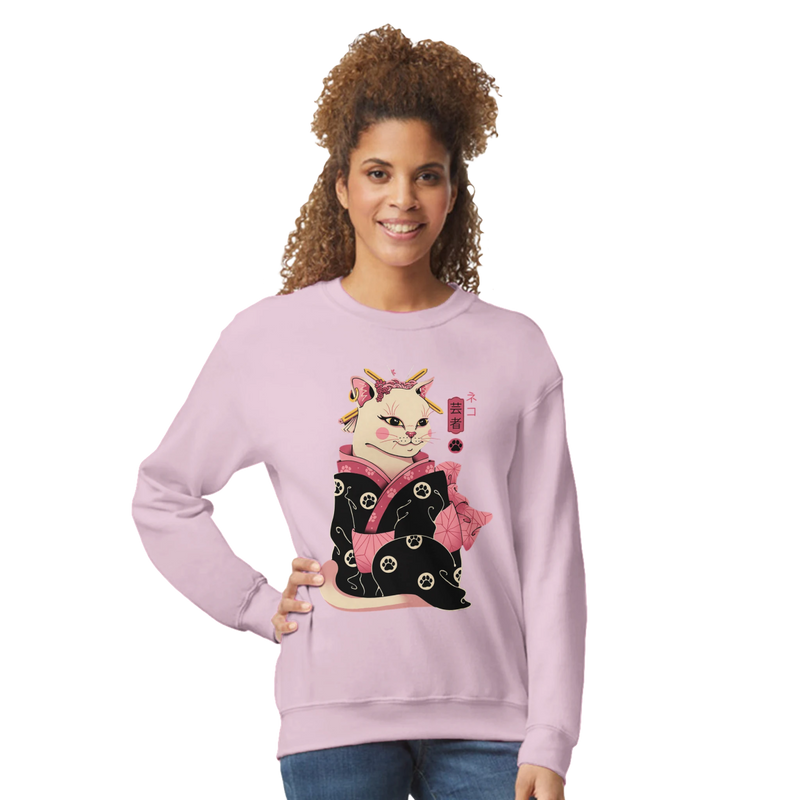 Immerse yourself in a poetic world where Japanese elegance meets irresistible feline charm. This women's crew-neck sweatshirt, in a soft lavender hue, features an exclusive and meticulously detailed design of a Geisha Cat . Inspired by Japanese traditions, the cat is depicted as a refined geisha, dressed in a stunning black kimono adorned with pink floral patterns and tiny cat paws . With its pink ears, gold hairpins, and rosy cheeks, this unique character is accompanied by the authentic Japanese character "芸者" (Geisha) and a paw print, adding a touch of authenticity and mystery.