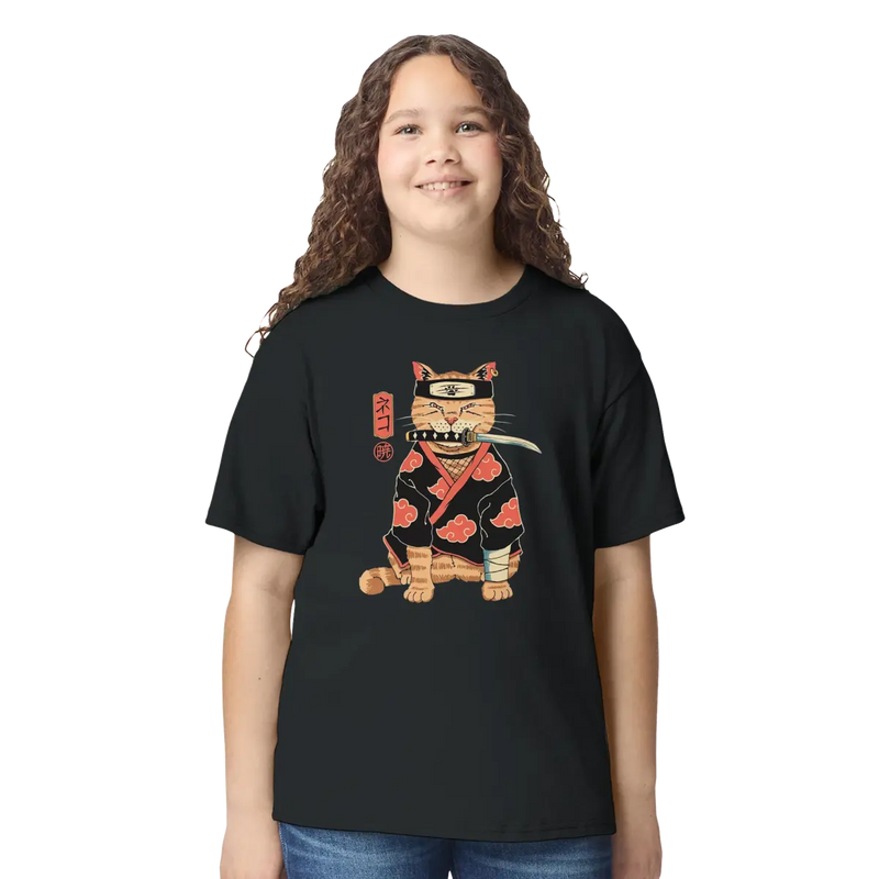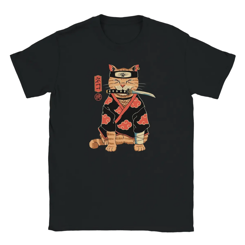 The central print features an orange feline transformed into a formidable ninja of the Akatsuki Clan. The cat sports the group's iconic attire: a ninja hat (kakashi) and a black cape adorned with the organization's characteristic red clouds. The details are meticulously crafted, from the sword held in its mouth to the bandage on its paw, giving it an attitude that is both cute and powerful. The finishing touch? The elegant Japanese characters that accompany it: 「ネコ」 (Neko, "Cat") and 「暁」 (Akatsuki, "Twilight"), for complete authenticity.