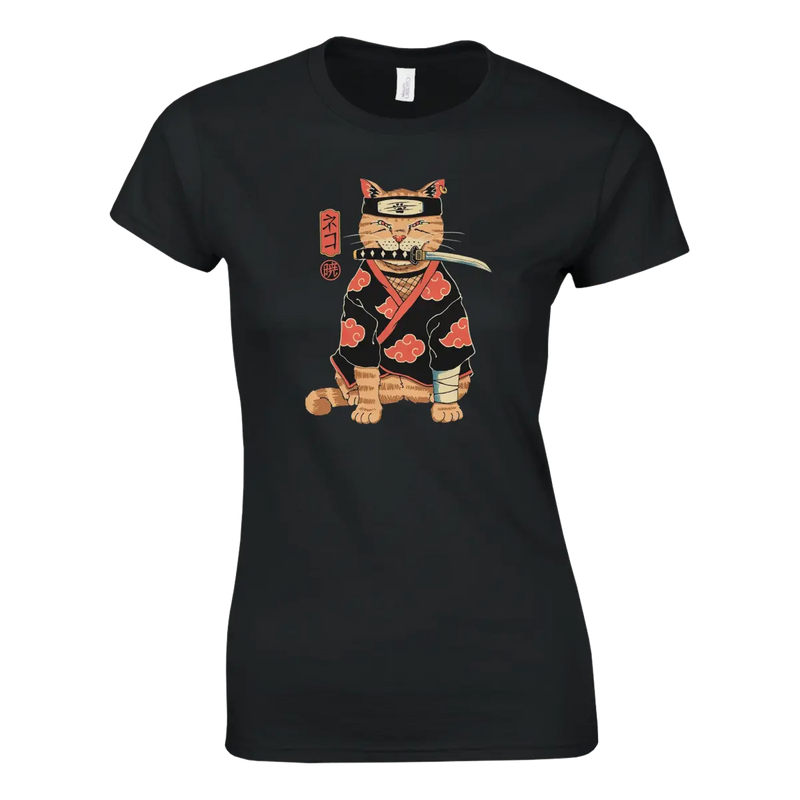 The central print features an orange feline transformed into a formidable ninja of the Akatsuki Clan. The cat sports the group's iconic attire: a ninja hat (kakashi) and a black cape adorned with the organization's characteristic red clouds. The details are meticulously crafted, from the sword held in its mouth to the bandage on its paw, giving it an attitude that is both cute and powerful. The finishing touch? The elegant Japanese characters that accompany it: 「ネコ」 (Neko, "Cat") and 「暁」 (Akatsuki, "Twilight"), for complete authenticity.