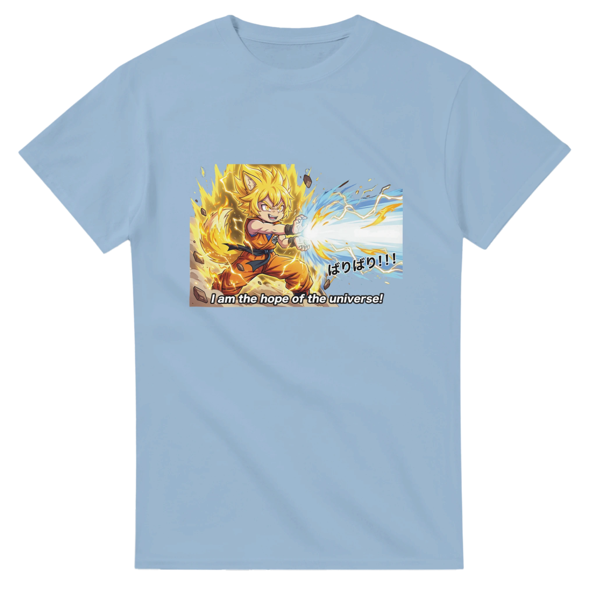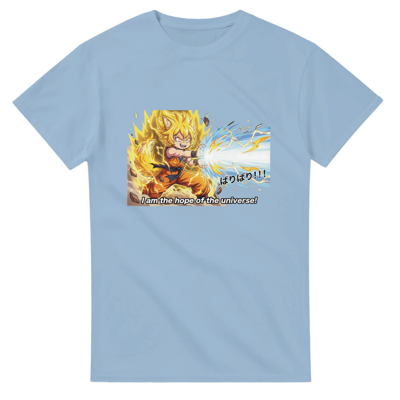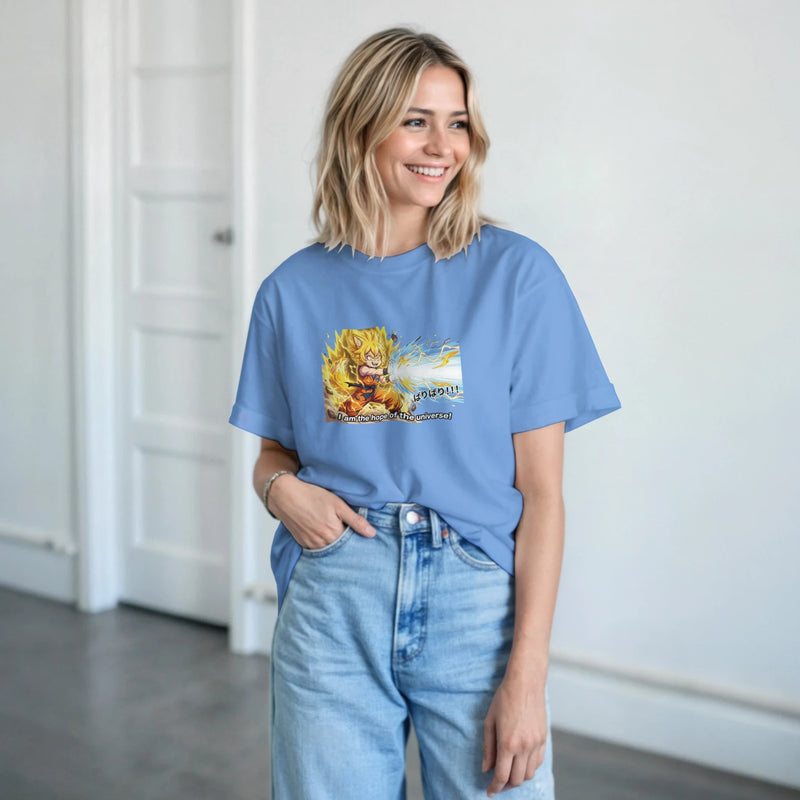 This light blue t-shirt is the perfect essential for a casual wardrobe. More than just a basic garment, it's a style statement for true fans. The vibrant and dynamic central illustration captures all the iconic energy of this legendary transformation.