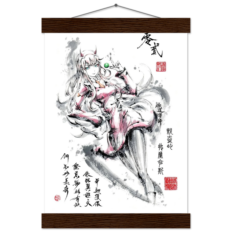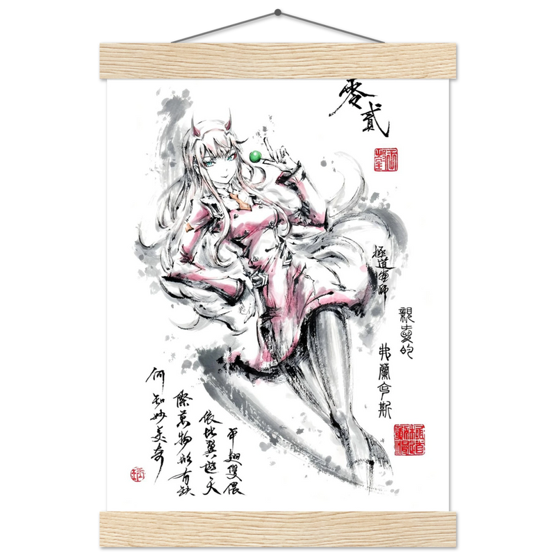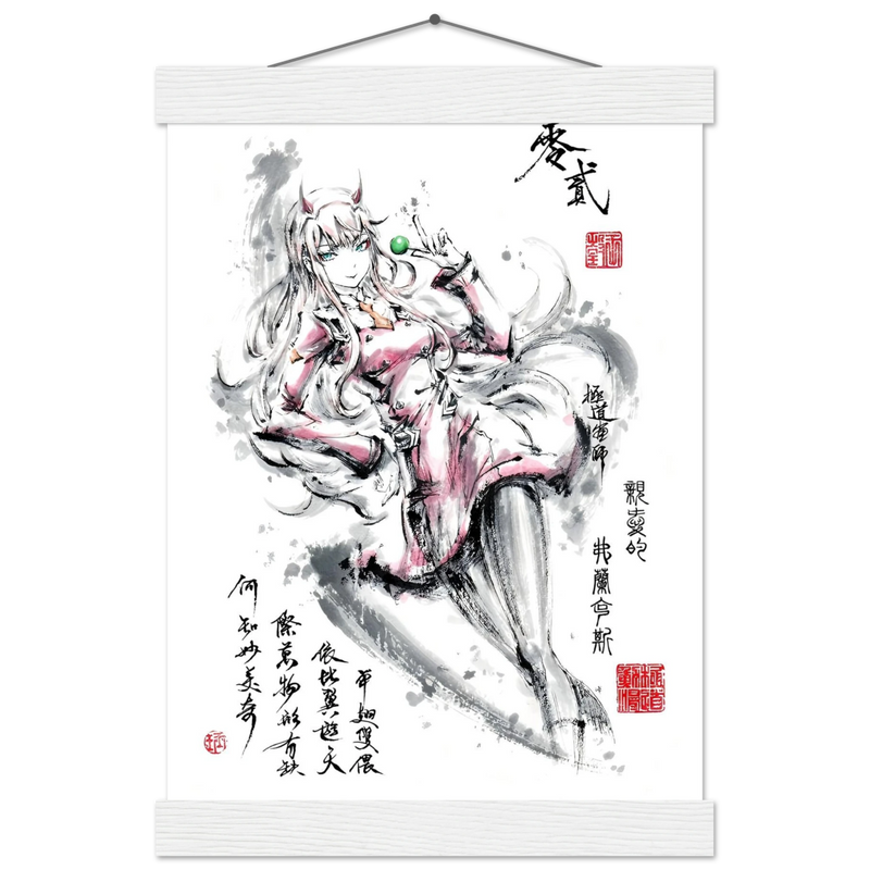 Discover a captivating artistic interpretation of Zero Two, the iconic heroine of the anime DARLING in the FRANXX , enhanced by the delicate aesthetics of sumi-e. This unique creation merges the mechanical world of the series with the poetry of oriental calligraphy, offering a vision where grace and power are one.