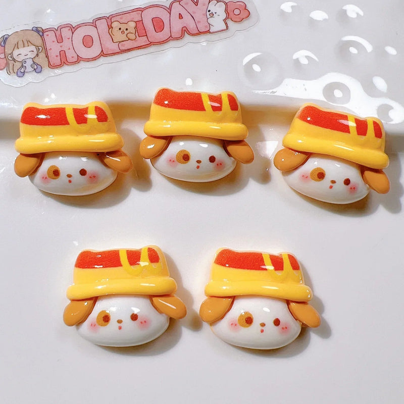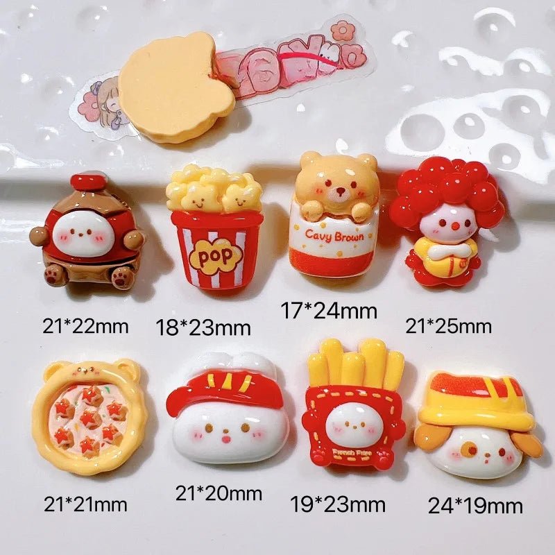 - Contenu : 10 cabochons en résine (motifs assorted : lapin, pizza, frites).