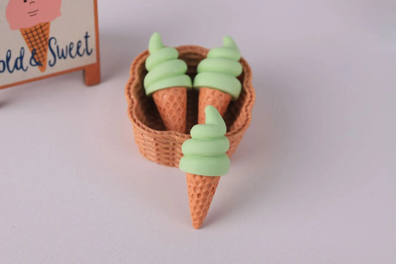 Chaque cône de glace est le fruit d’un savoir-faire minutieux. Grâce à l'utilisation de résine de haute qualité et de techniques de finition avancées, ces miniatures reproduisent avec une fidélité remarquable les textures, les couleurs vives et même l'aspect brillant d'une véritable glace. Leur petite taille (environ 1.5 cm de largeur sur 4 cm de hauteur) en fait des accessoires parfaitement proportionnés pour les décors miniatures.