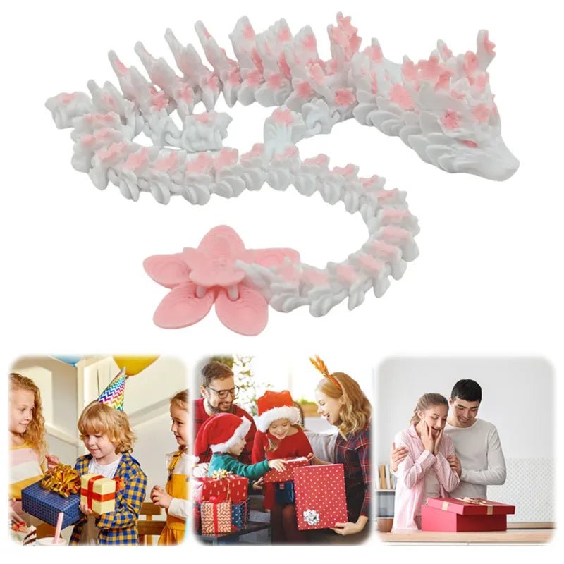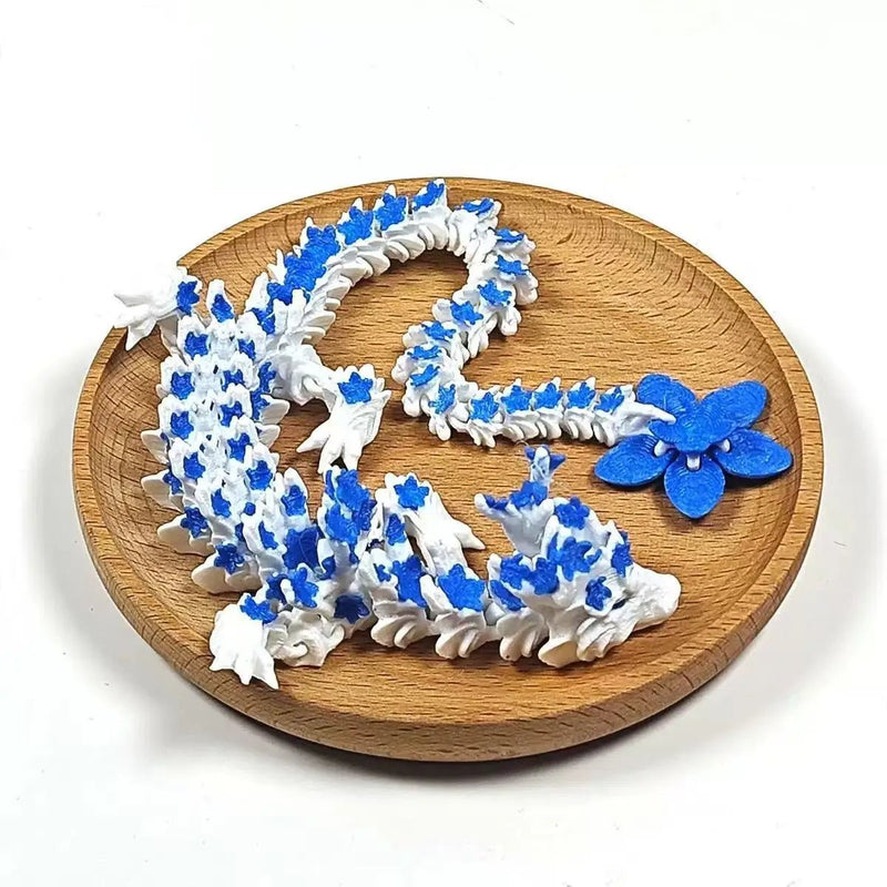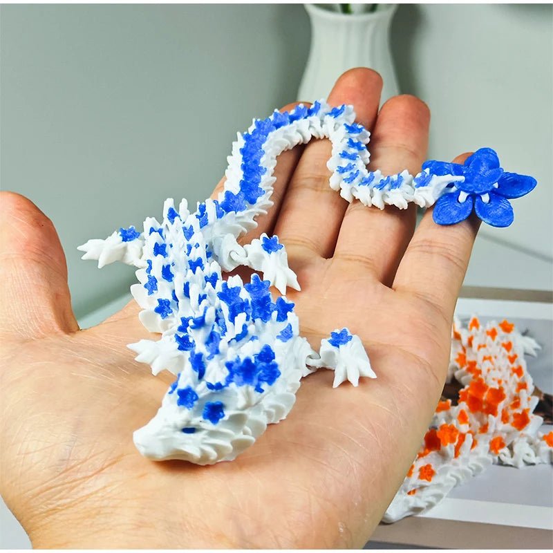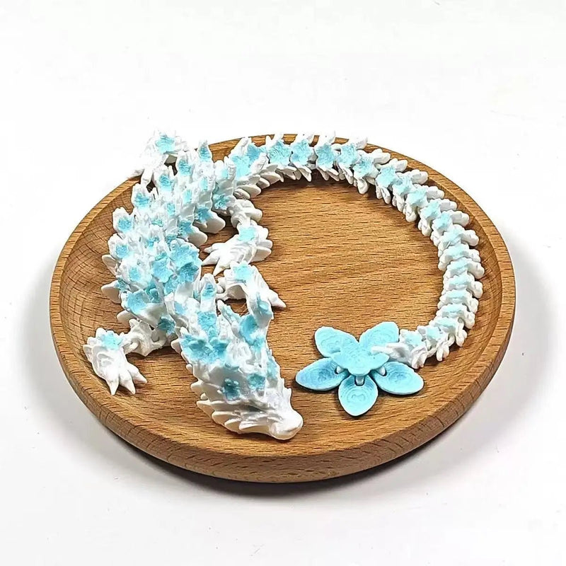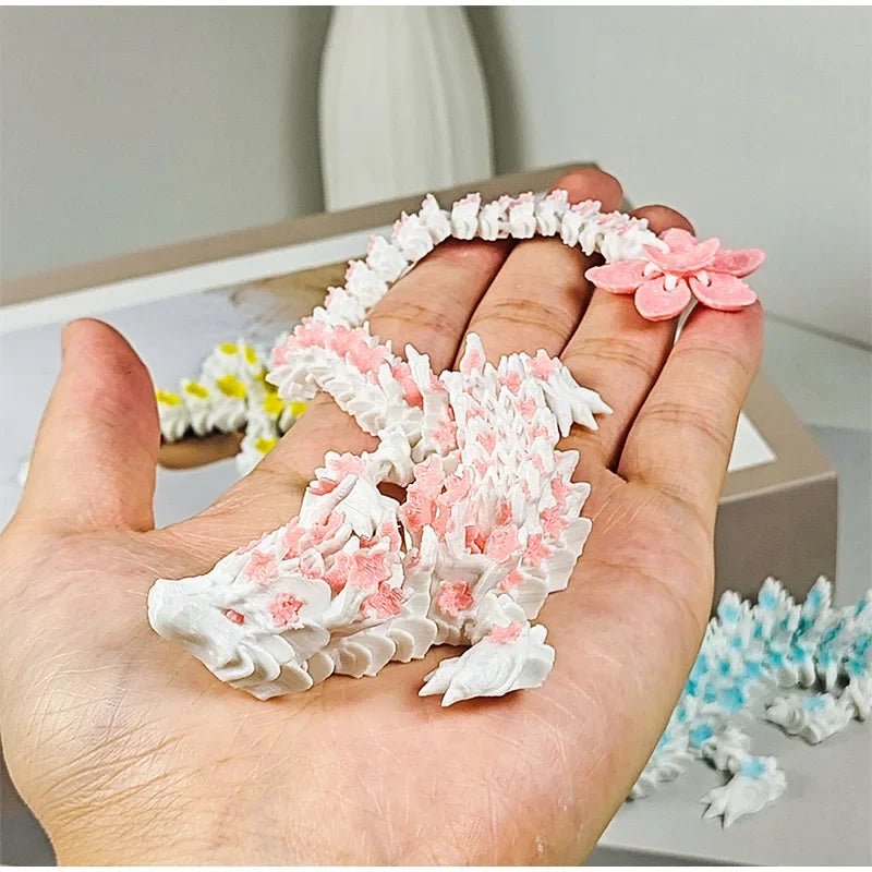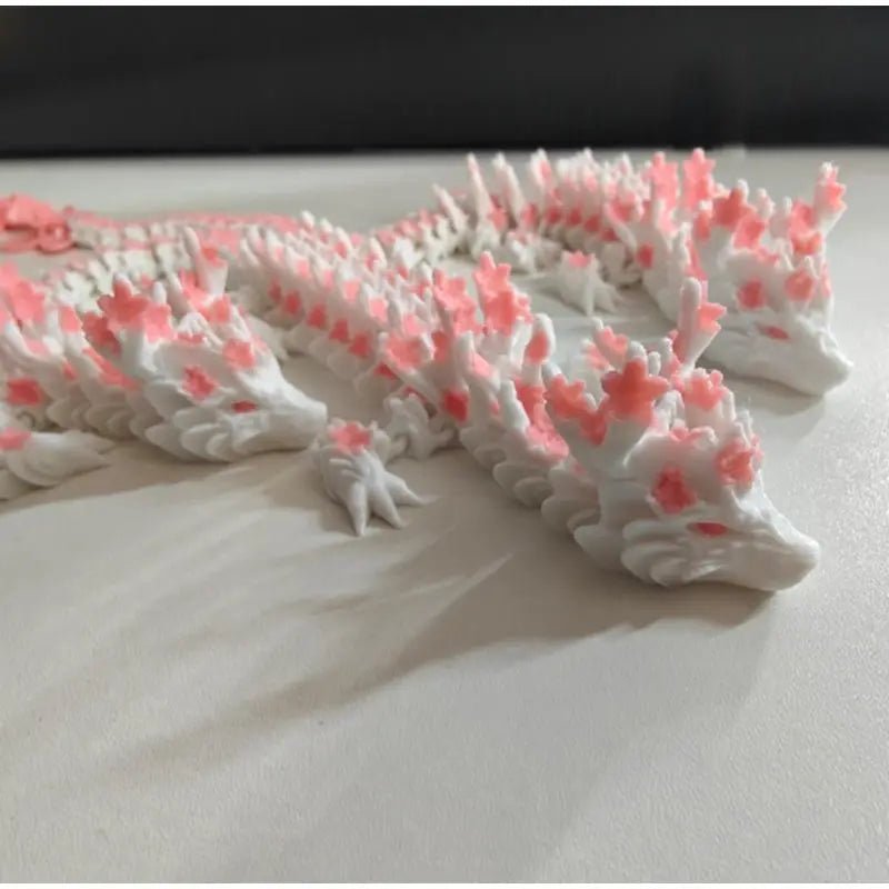Ce dragon se distingue par son corps translucide et cristallin, semblant taillé dans la glace ou le cristal. L’élément le plus charmant ? Il est délicatement orné de fleurs de cerisier roses, apportant une touche de douceur et de poésie asiatique à sa silhouette majestueuse. Chaque détail, des écailles à la crête dorsale, est rendu avec une grande finesse grâce à la technologie d’impression 3D.