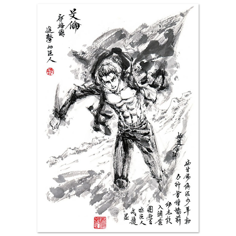 Plongez au cœur de l’univers épique de L’Attaque des Titans avec cette œuvre artistique saisissante, capturant la métamorphose légendaire d’Éren Jäger. Réalisée dans un style graphique fusionnant la puissance du manga et la finesse de la calligraphie orientale, cette création transcende l’illustration pour devenir un véritable hommage au personnage.
