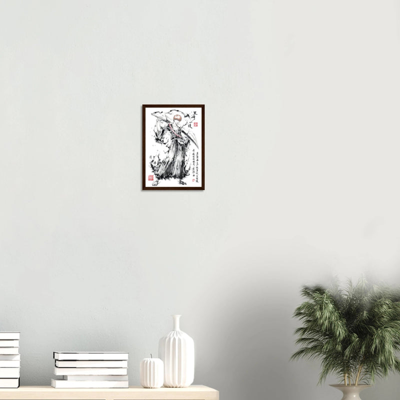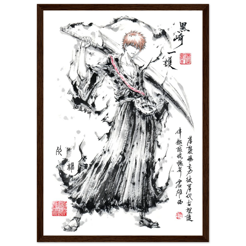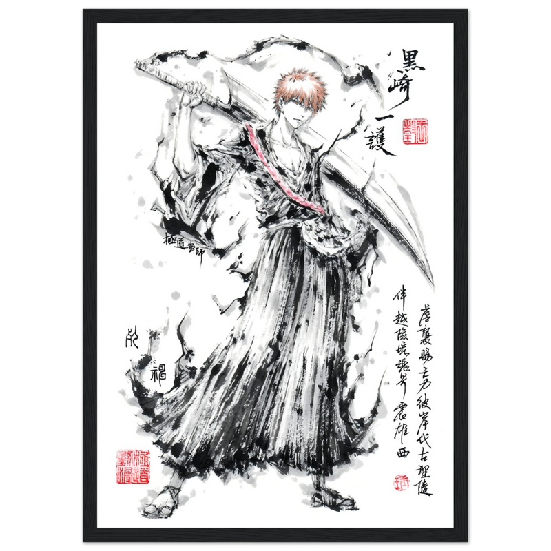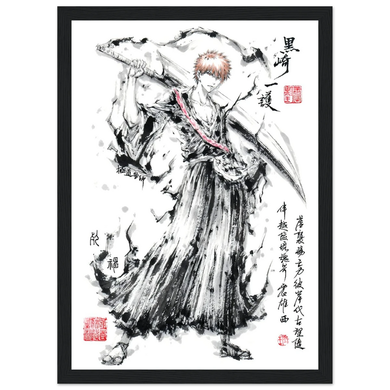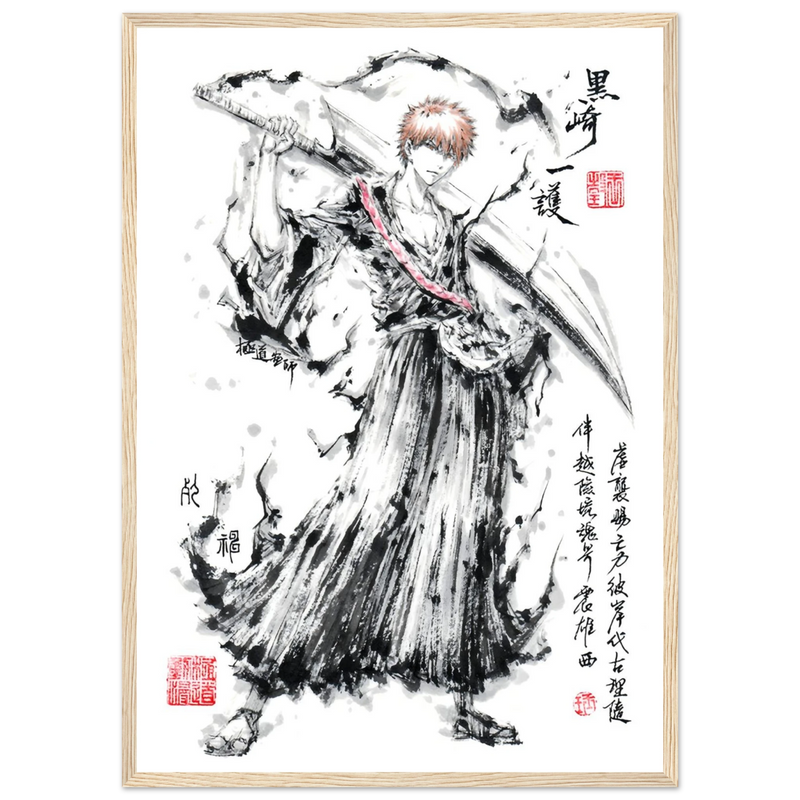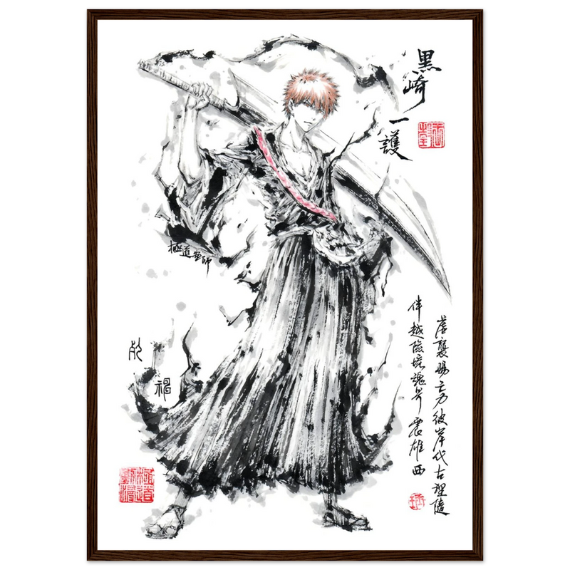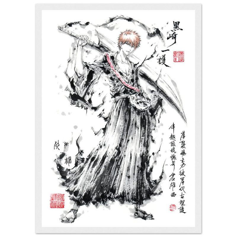 Plongez dans l'univers spirituel de BLEACH avec cette œuvre d'art unique capturant l'essence du célèbre protagoniste Ichigo Kurosaki. Réalisée dans le style traditionnel de l'encre de Chine, cette création fusionne l'intensité du shōnen avec l'élégance intemporelle de l'esthétique orientale.