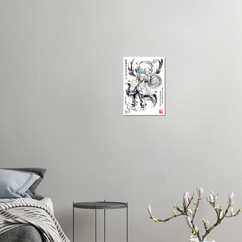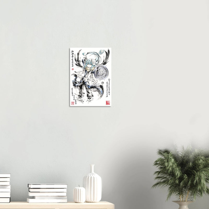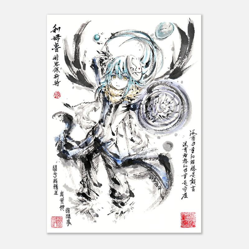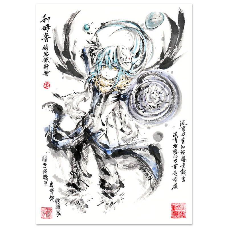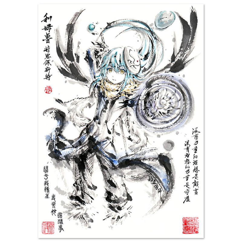 Découvrez une interprétation artistique époustouflante de Rimuru Tempest, le héros emblématique de l'anime Moi, quand je me réincarne en Slime. Cette création exclusive allie la magie de l'univers fantastique à la finesse traditionnelle de l'esthétique sumi-e, dans une composition où l'encre et les lavis donnent vie au slime légendaire.