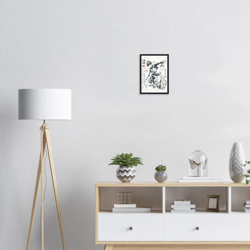 - Le fond en lavis gris dégradé évoque les brumes mystérieuses des estampes anciennes, mettant en valeur la silhouette dynamique du joueur