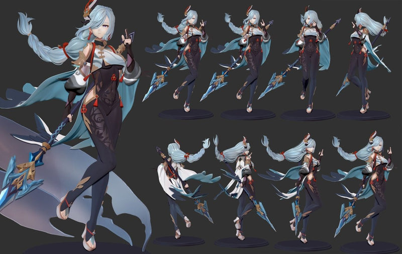 Inspiré par les images fournies, le modèle met en scène Shenhe dans une posture unique : une jambe droite tendue, l'autre légèrement fléchie, la main droite avançant avec une épée élégante (arme à long manche ornée de pointes, visible sur la photo 5), tandis que la main gauche se plie en un geste gracieux. Ses longs cheveux flottants, sa coiffure ornée de bijoux complexes et sa cape flottante (détail visible sur les photos 1 et 4) renforcent le mouvement. Le costume, avec ses motifs gravés fins, ses accents rouges et dorés et sa silhouette aérodynamique, est fidèlement reproduit pour une immersion totale. La teinte gris clair avec des reflets bleus subtils (photo 5) et le fond noir mettent en valeur chaque détail, du métal de l'arme aux plis de la cape.