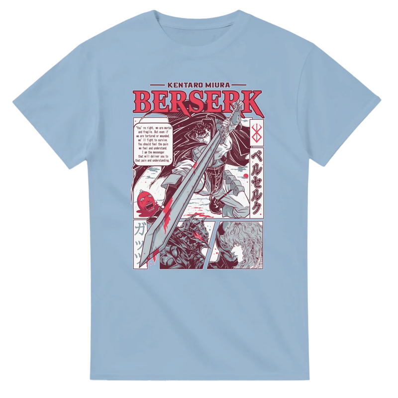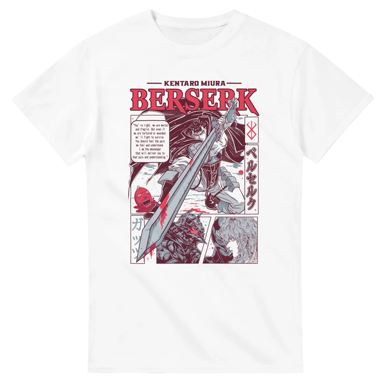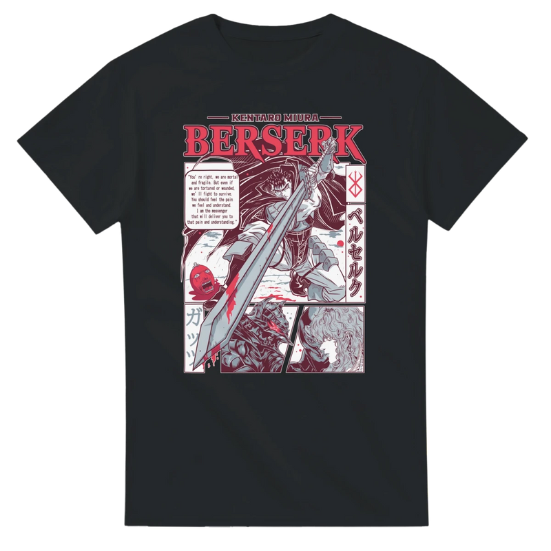 Exprimez votre passion pour Berserk avec ce T-shirt 100% coton, mettant en scène Guts et Griffith dans un style manga saisissant ! Inspiré de l'univers sombre et épique du célèbre manga de Kentaro Miura, ce vêtement au design audacieux et Instagrammable est l'essentiel parfait pour afficher votre esprit fan au quotidien.