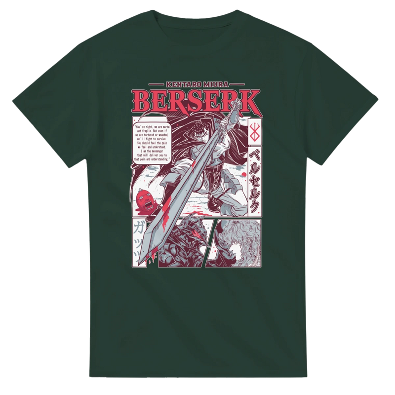 Adoptez ce T-shirt 'Berserk' et portez fièrement vos héros et l'univers légendaire de Kentaro Miura. Choisissez votre taille (S à 3XL) et votre couleur (Forest Green ou Noir) pour un vêtement confortable, durable et au design unique qui fera tourner les têtes. Commandez le vôtre dès aujourd'hui !