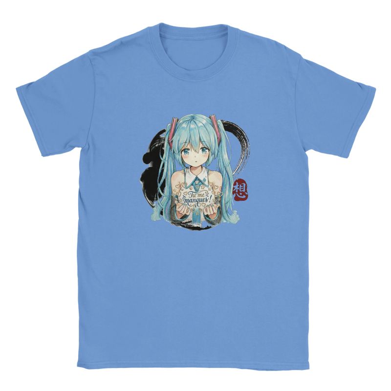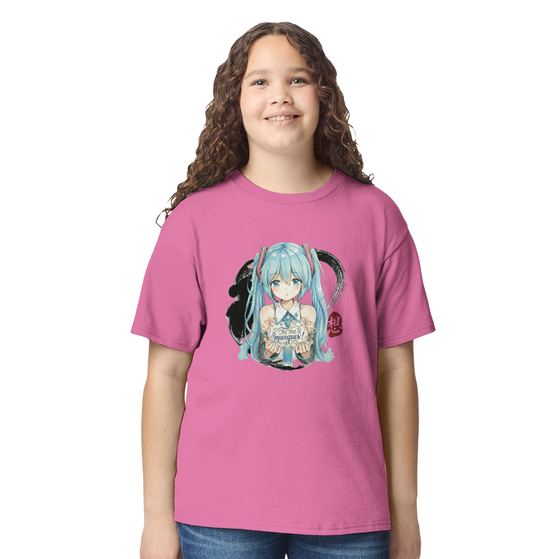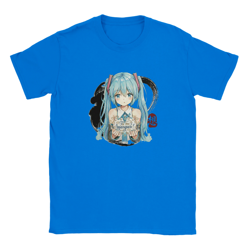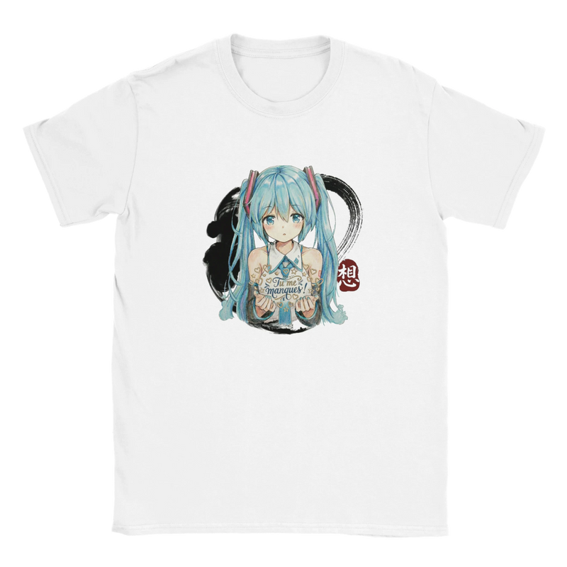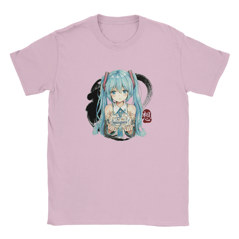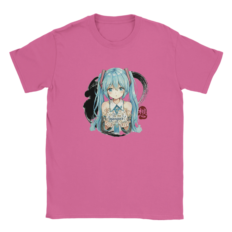 Offrez à votre enfant un vêtement aussi joyeux que tendre avec ce T-shirt à col rond « Hatsune Miku « Tu me manques ! » ». Comme le montre la photo, ce modèle dans un doux rose vif arbore une illustration centrale et colorée de l’icône virtuelle adorée, Hatsune Miku. Représentée avec ses longues queues de cheveu bleu turquoise emblématiques et son style dynamique, elle apporte une touche de magie et d’énergie. Le message manuscrit « Tu me manques ! » ajoute une dimension émotionnelle unique, faisant de ce T-shirt bien plus qu’un simple vêtement : une douce déclaration à porter au quotidien.