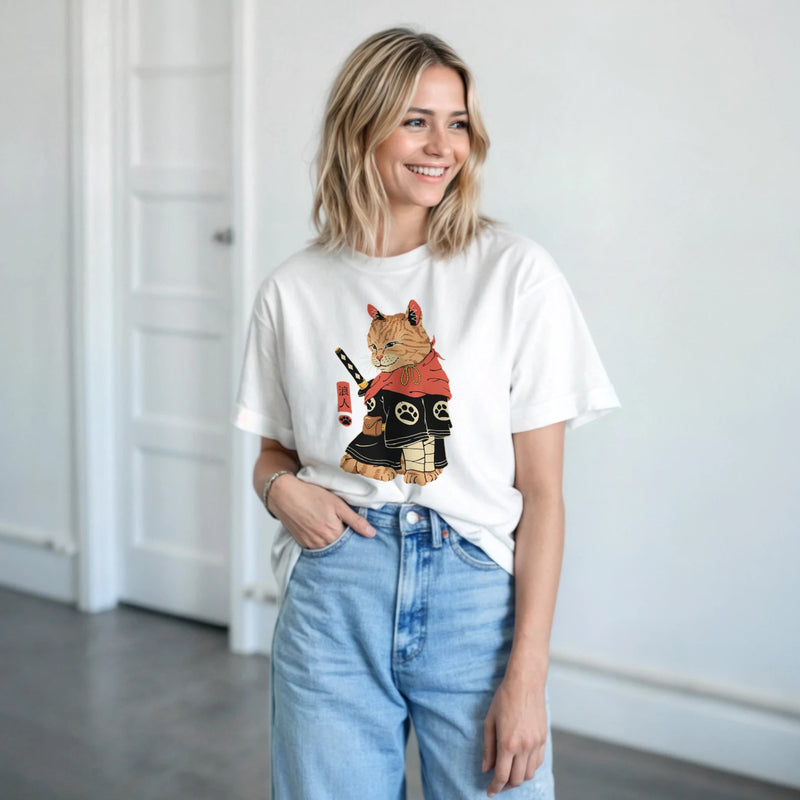 Comme le montre notre modèle, ce T-shirt crewneck en coton lourd allie confort quotidien et un style japonais résolument affirmé. Il arbore un design graphique unique de Chat Samouraï, représentant un félin déterminé vêtu d’un kimono noir et portant fièrement une épée. Les inscriptions « 浪人 » (Rōnin) et « XUANLAI » ajoutent une touche d’authenticité et de mystère à ce motif captivant.
