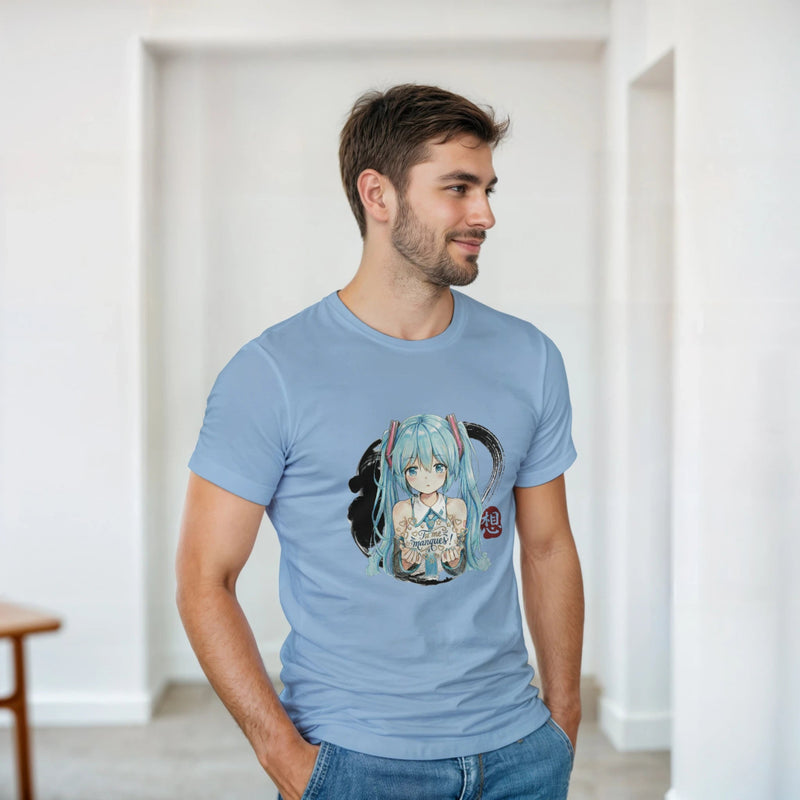 Portez un message tendre et affichez votre passion avec ce T-shirt crewneck unisexe en coton lourd, orné d’un design exclusif mettant en scène l’icône virtuelle mondiale, Hatsune Miku. Plus qu’un simple motif, cette illustration capture l’essence de la chanteuse à la célèbre double queue bleu turquoise, dans un style qui évoque à la fois sa grâce et son univers énigmatique.