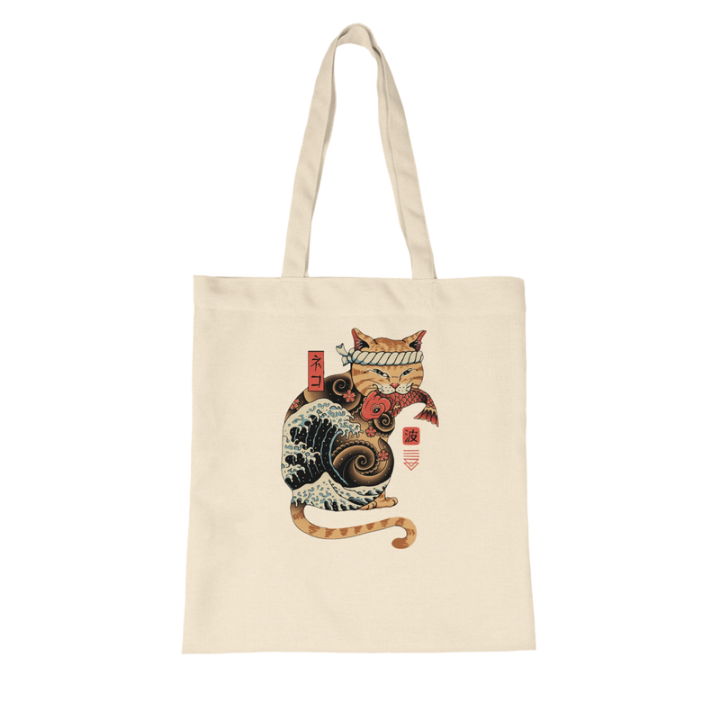 Faites le choix d'un style qui a du sens. Adoptez le sac fourre-tout biologique au design unique « Chat, Vagues & Kanji » !