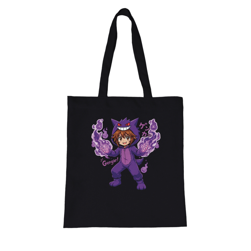 Ce sac est bien plus qu'un accessoire pratique : c'est une déclaration de style responsable. Il arbore un imprimé unique et coloré de Ruka déguisé en Gengar, l'un des Pokémon Fantôme les plus populaires, parfaitement mis en valeur sur un fond noir élégant.