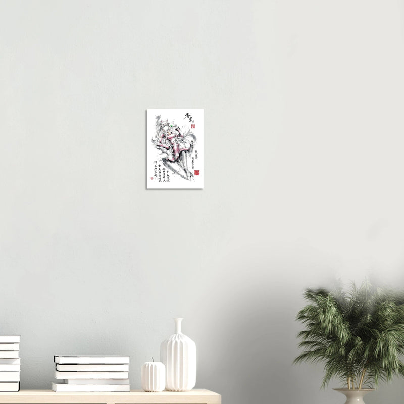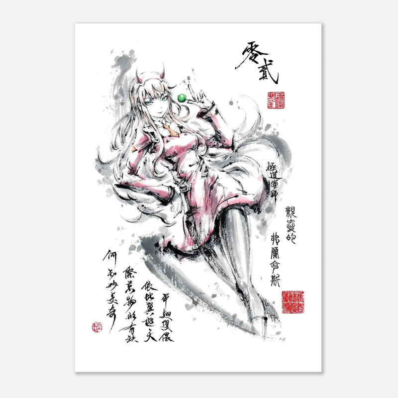 Découvrez une interprétation artistique envoûtante de Zéro Two, l'héroïne iconique de l'anime DARLING in the FRANXX, sublimée par la délicatesse de l'esthétique sumi-e. Cette création unique fusionne l'univers mécanique de la série avec la poésie de la calligraphie orientale, offrant une vision où la grâce et la puissance ne font qu'un.