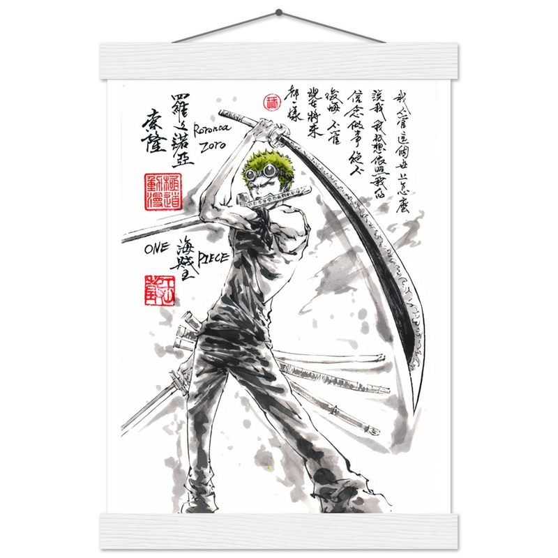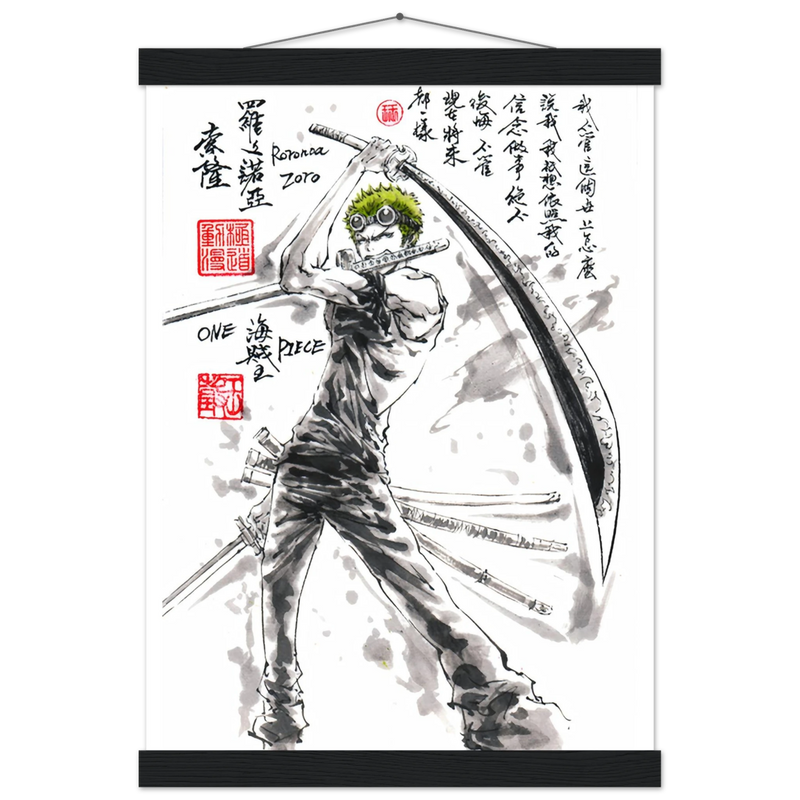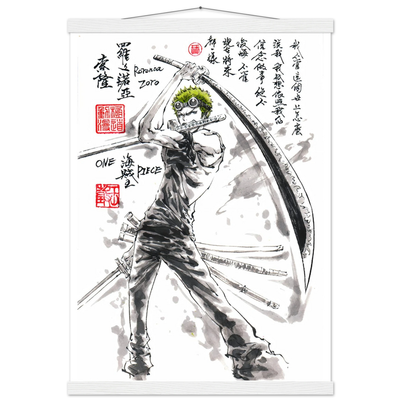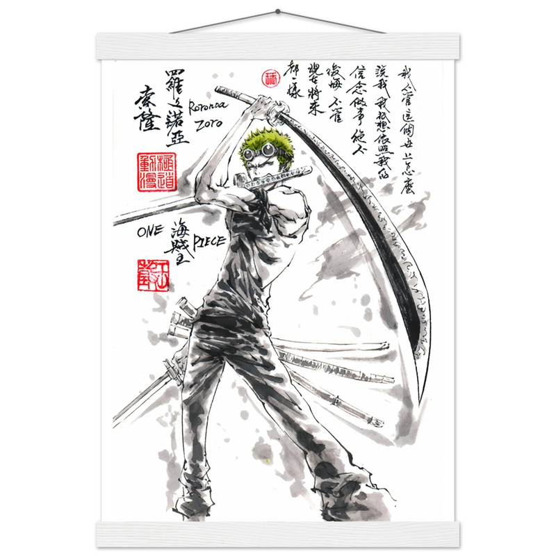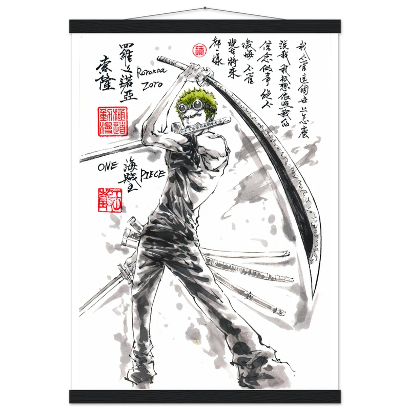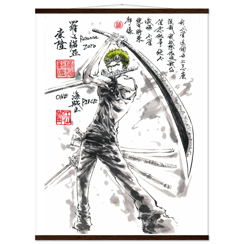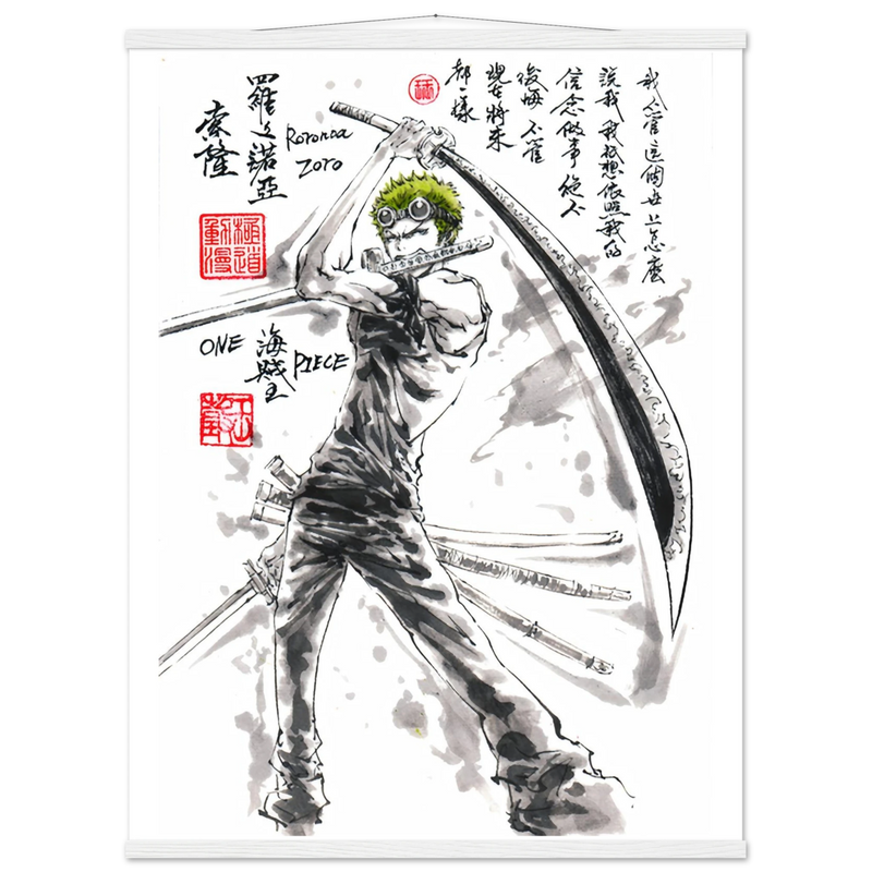 Découvrez une interprétation artistique époustouflante de Roronoa Zoro, le sabreur emblématique de l'équipage de Luffy dans One Piece. Cette œuvre unique fusionne l'intensité du manga avec la délicatesse de l'esthétique sumi-e traditionnelle, créant un hommage visuel où la force brute rencontre la poésie de l'encre.