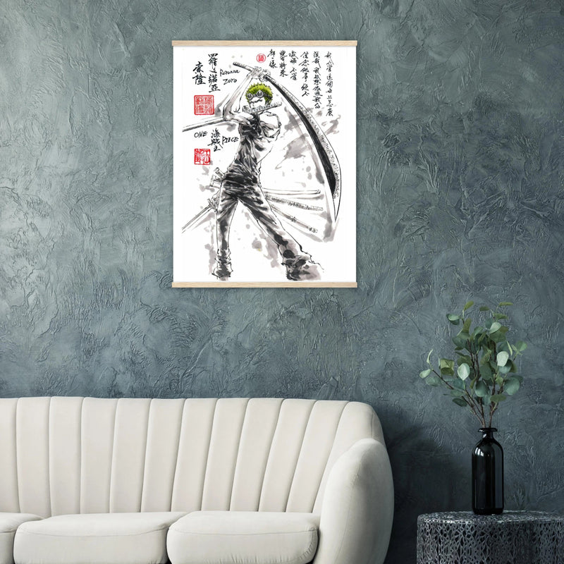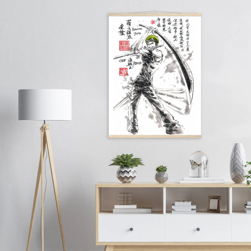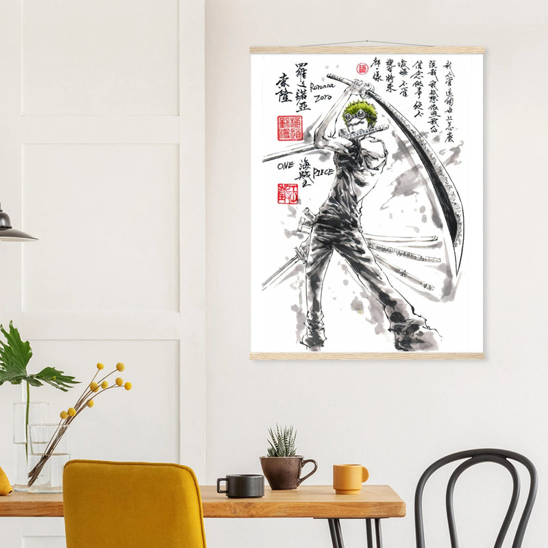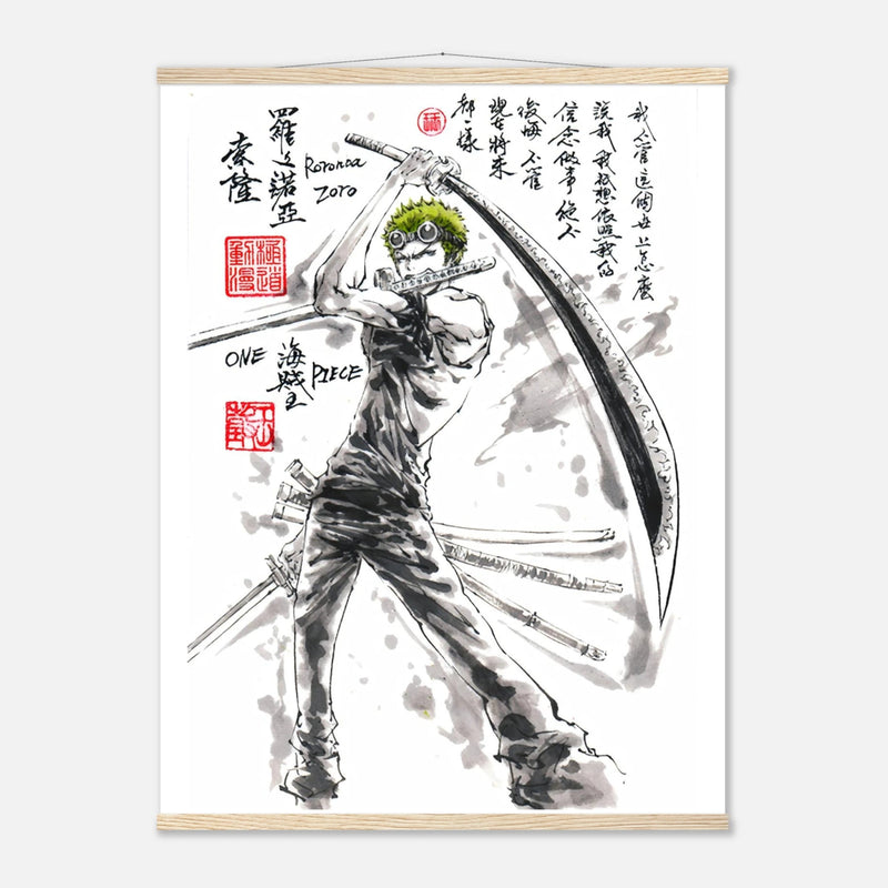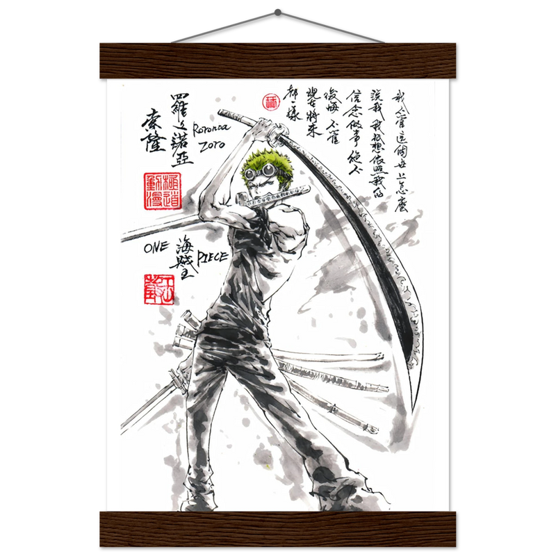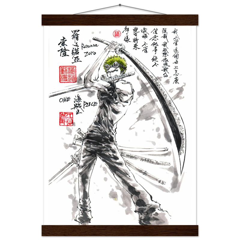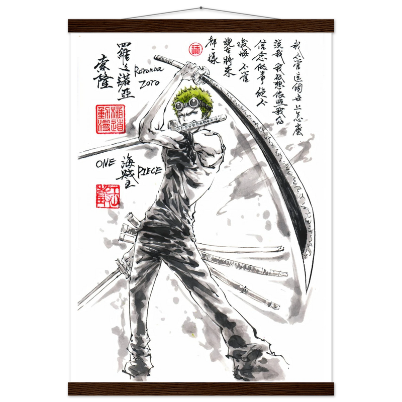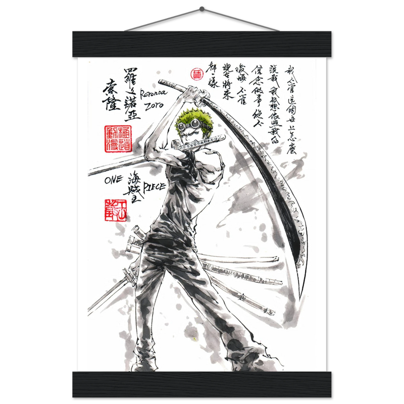 Découvrez une interprétation artistique époustouflante de Roronoa Zoro, le sabreur emblématique de l'équipage de Luffy dans One Piece. Cette œuvre unique fusionne l'intensité du manga avec la délicatesse de l'esthétique sumi-e traditionnelle, créant un hommage visuel où la force brute rencontre la poésie de l'encre.