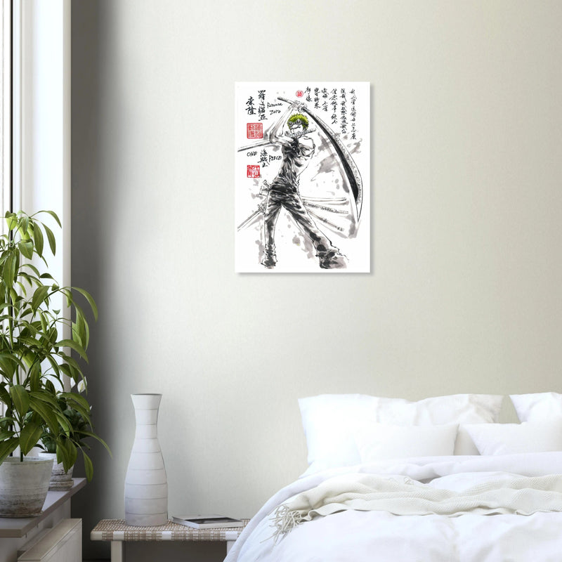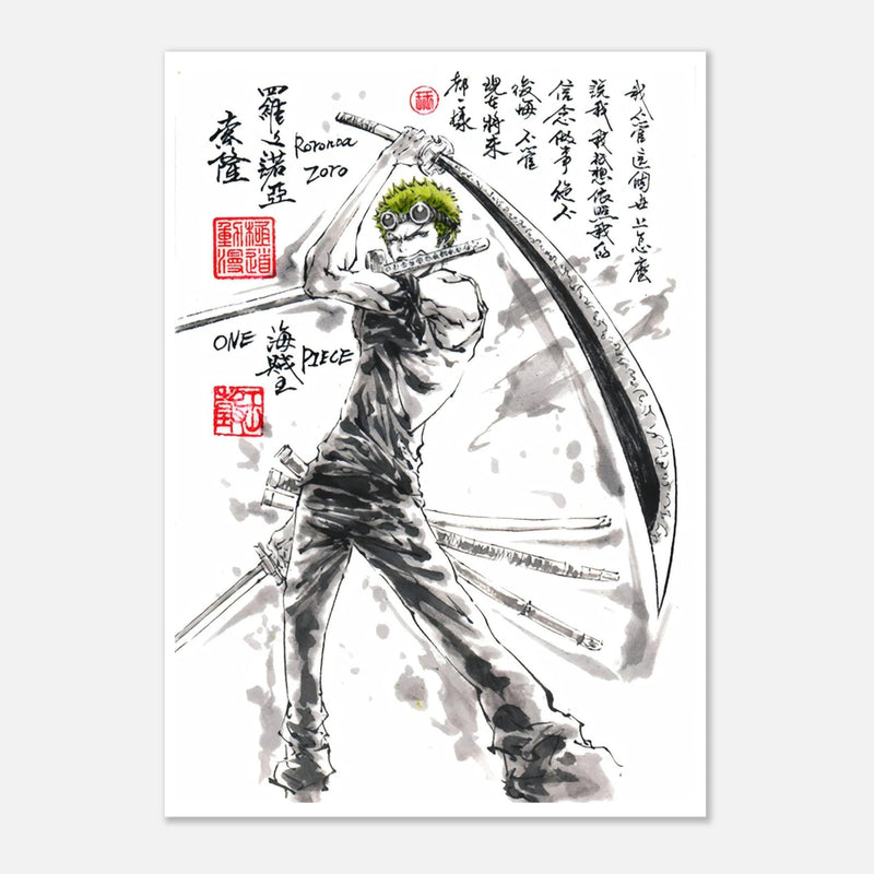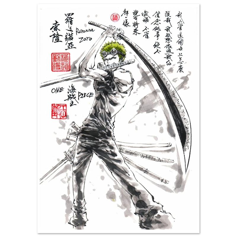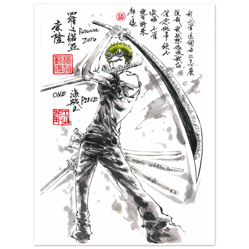 Découvrez une interprétation artistique époustouflante de Roronoa Zoro, le sabreur emblématique de l'équipage de Luffy dans One Piece. Cette œuvre unique fusionne l'intensité du manga avec la délicatesse de l'esthétique sumi-e traditionnelle, créant un hommage visuel où la force brute rencontre la poésie de l'encre.
