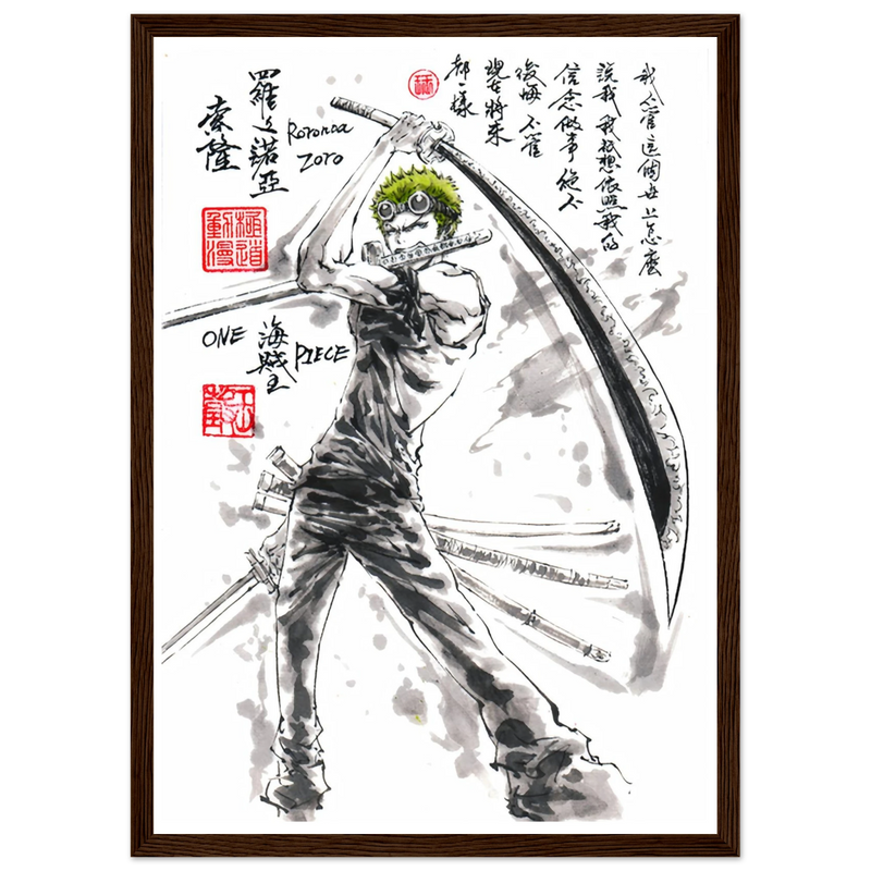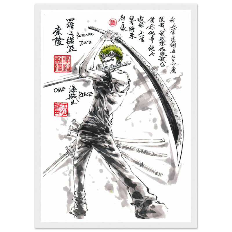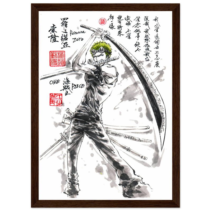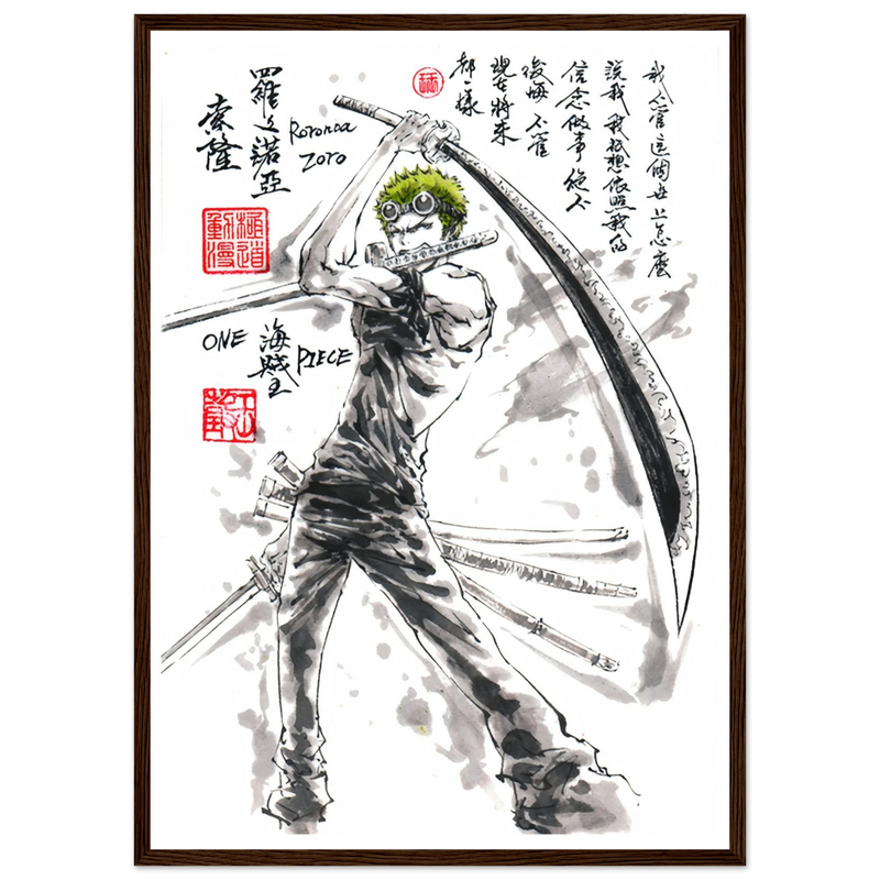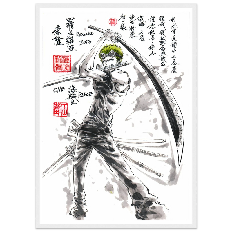 Découvrez une interprétation artistique époustouflante de Roronoa Zoro, le sabreur emblématique de l'équipage de Luffy dans One Piece. Cette œuvre unique fusionne l'intensité du manga avec la délicatesse de l'esthétique sumi-e traditionnelle, créant un hommage visuel où la force brute rencontre la poésie de l'encre.