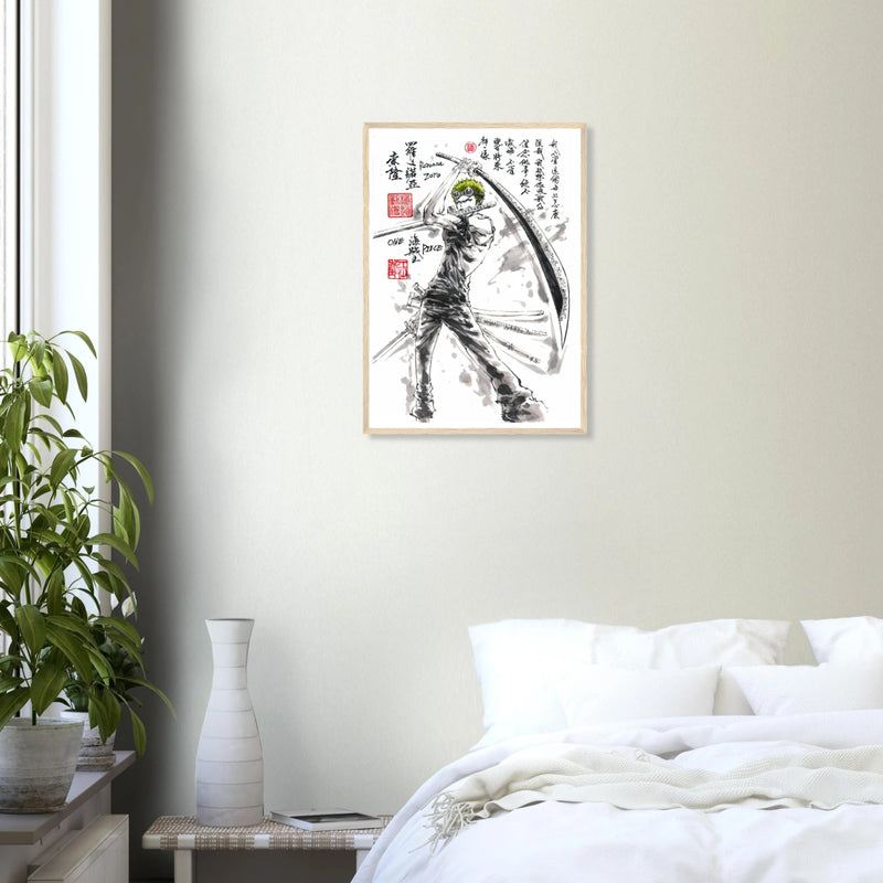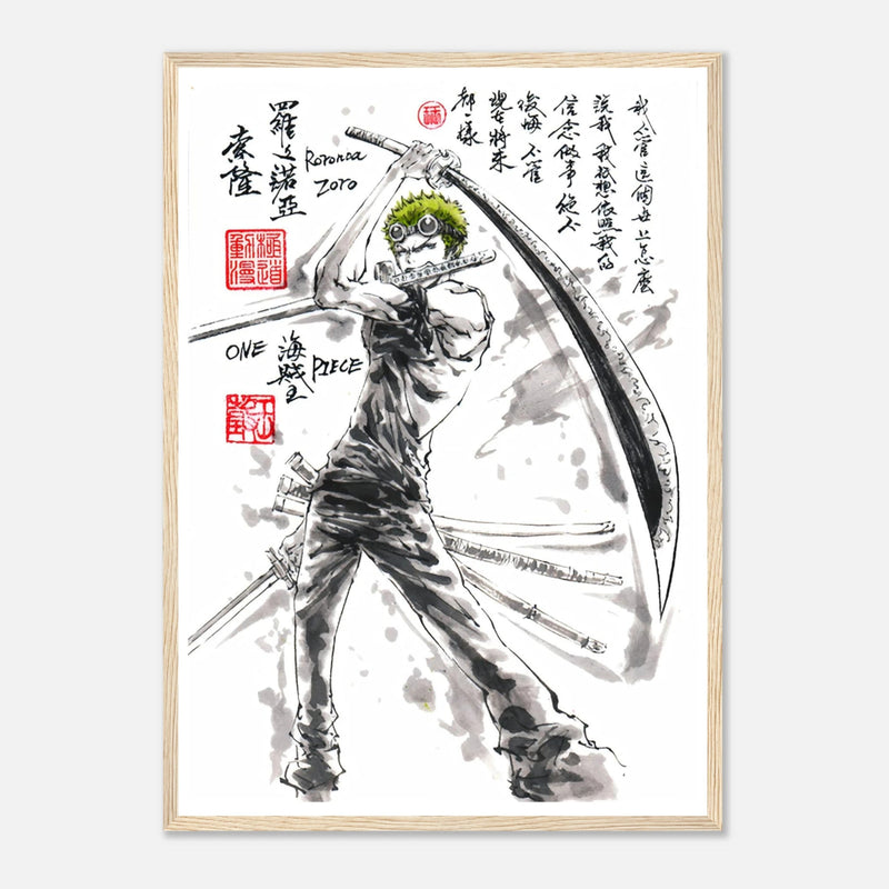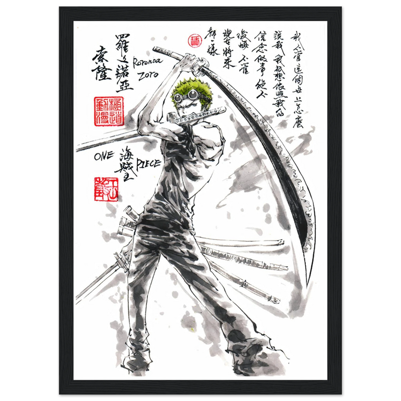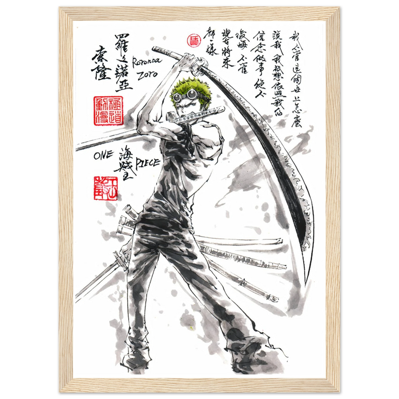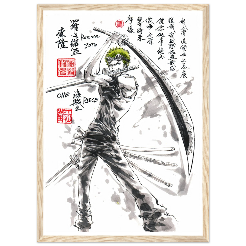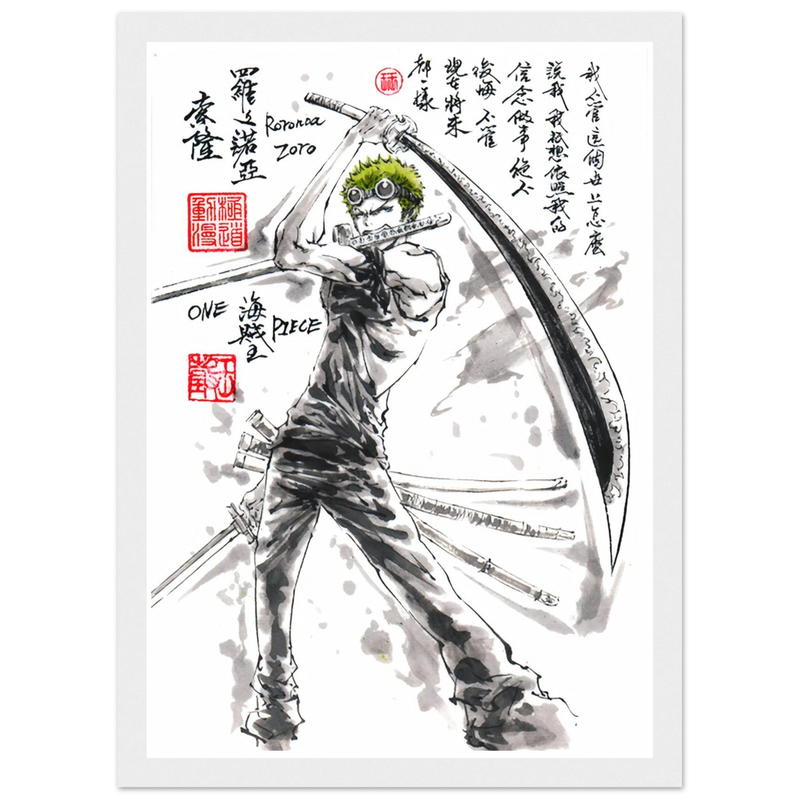 Découvrez une interprétation artistique époustouflante de Roronoa Zoro, le sabreur emblématique de l'équipage de Luffy dans One Piece. Cette œuvre unique fusionne l'intensité du manga avec la délicatesse de l'esthétique sumi-e traditionnelle, créant un hommage visuel où la force brute rencontre la poésie de l'encre.